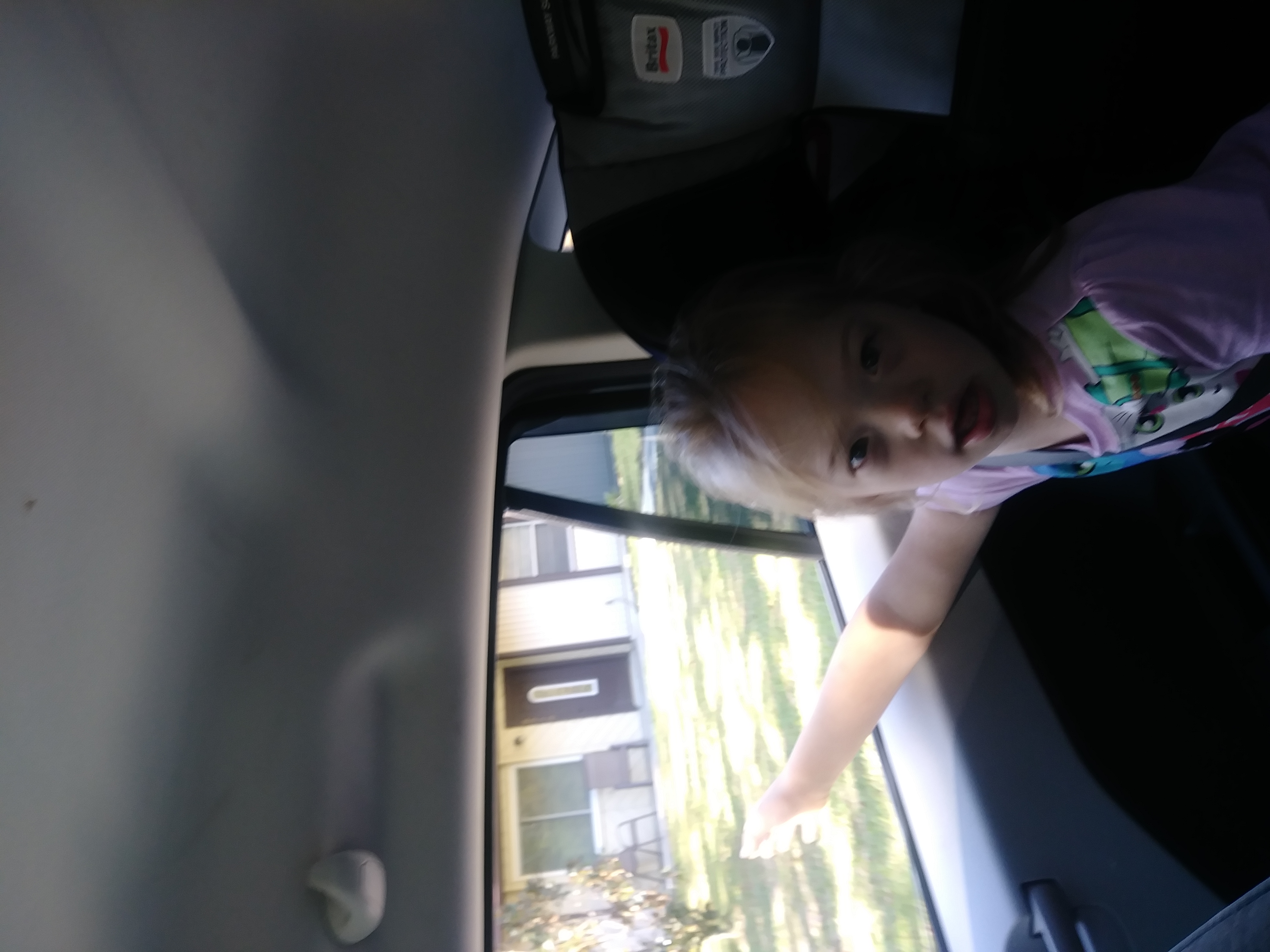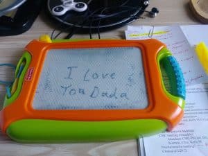 Silly Grant. Jenna riding in Grant’s big kid booster seat and realizing she can roll down the window. And a message that Grant left on my desk for me one morning for me to find when I started work.
