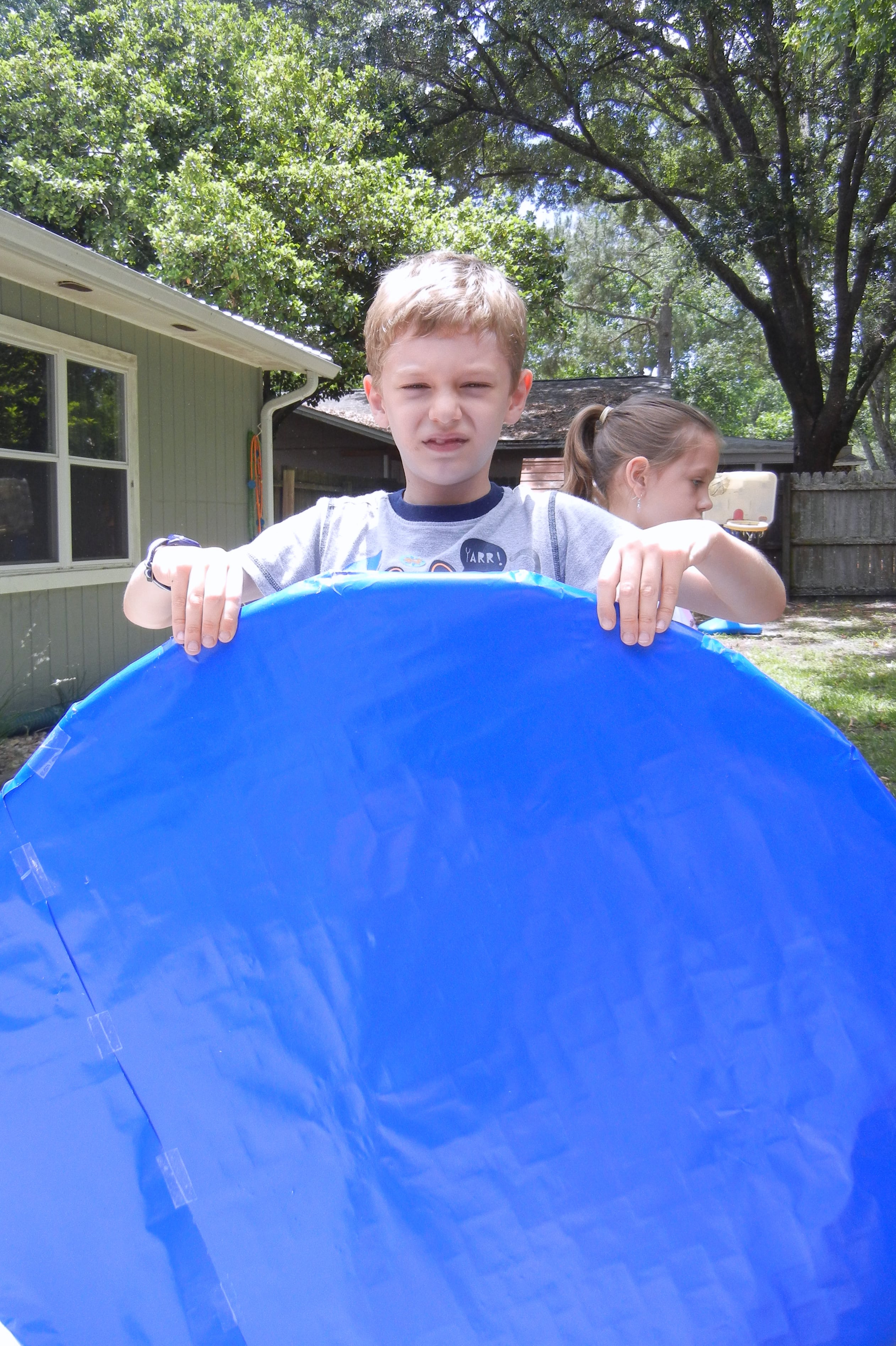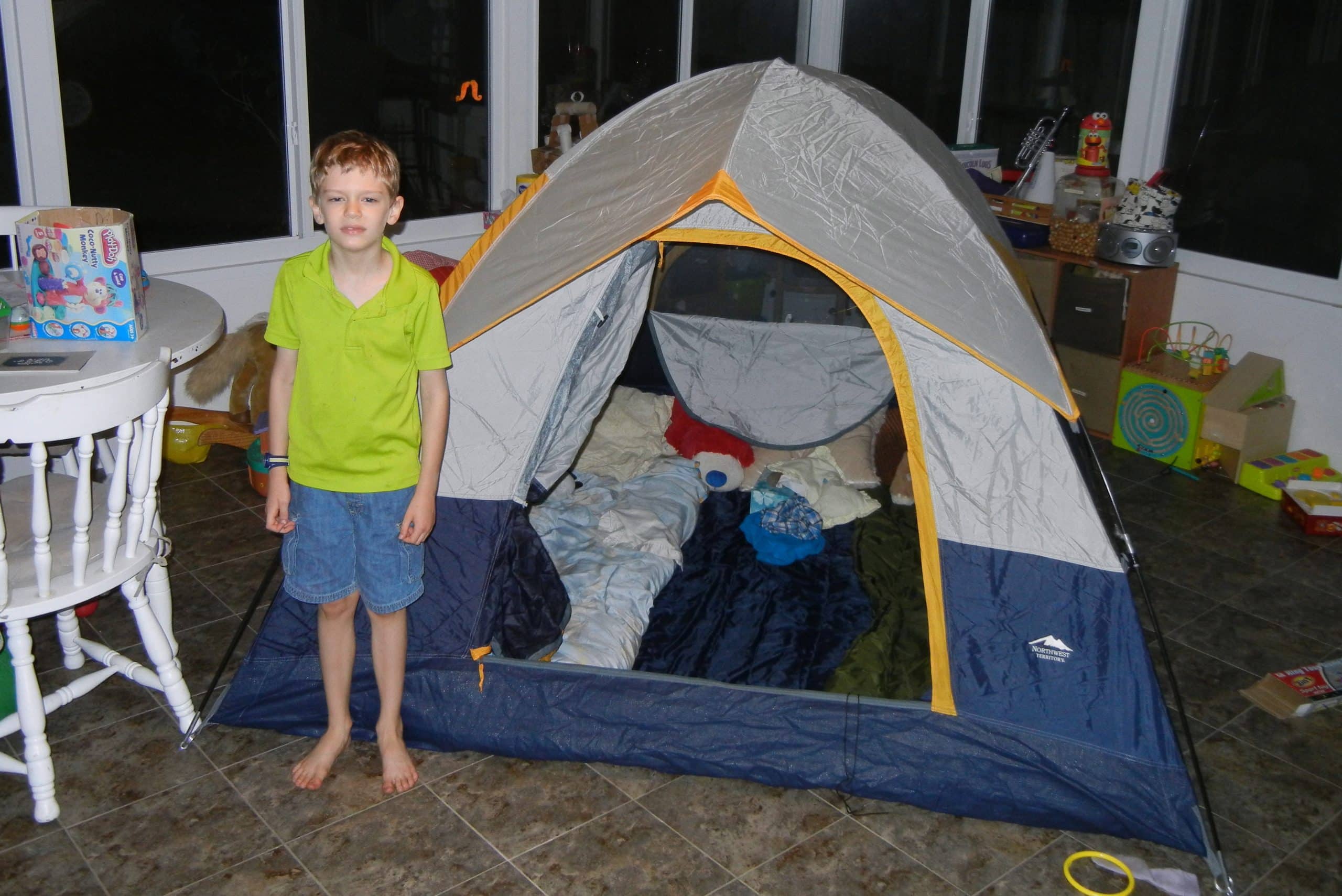 For Grant’s birthday, he asked to camp out in the back yard in our tent. To make sure that the tent was still in good shape, we set it up in the porch last week. It made a great playhouse for a week, but we planned to move it outside on Friday night for Grant and I to sleep in.