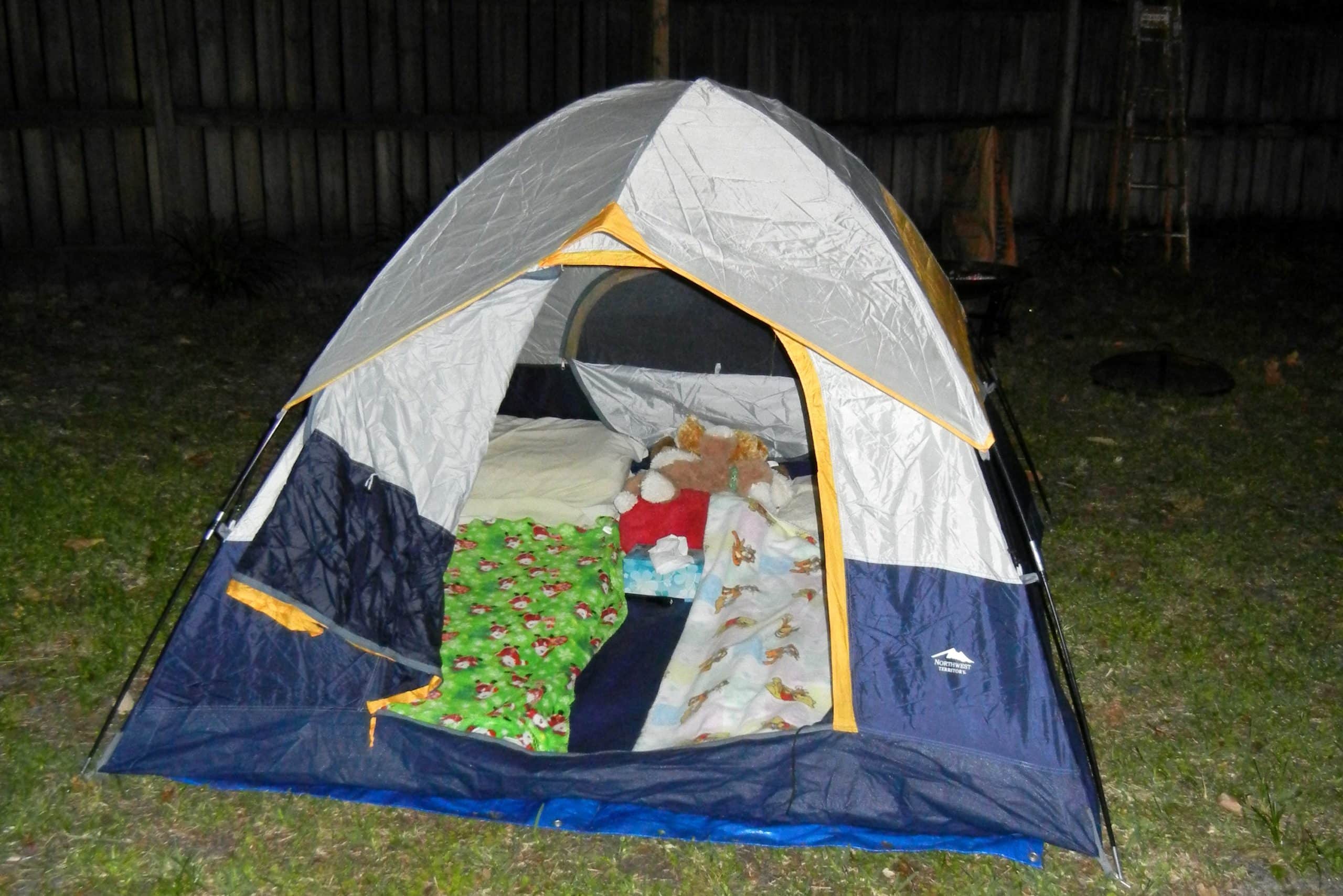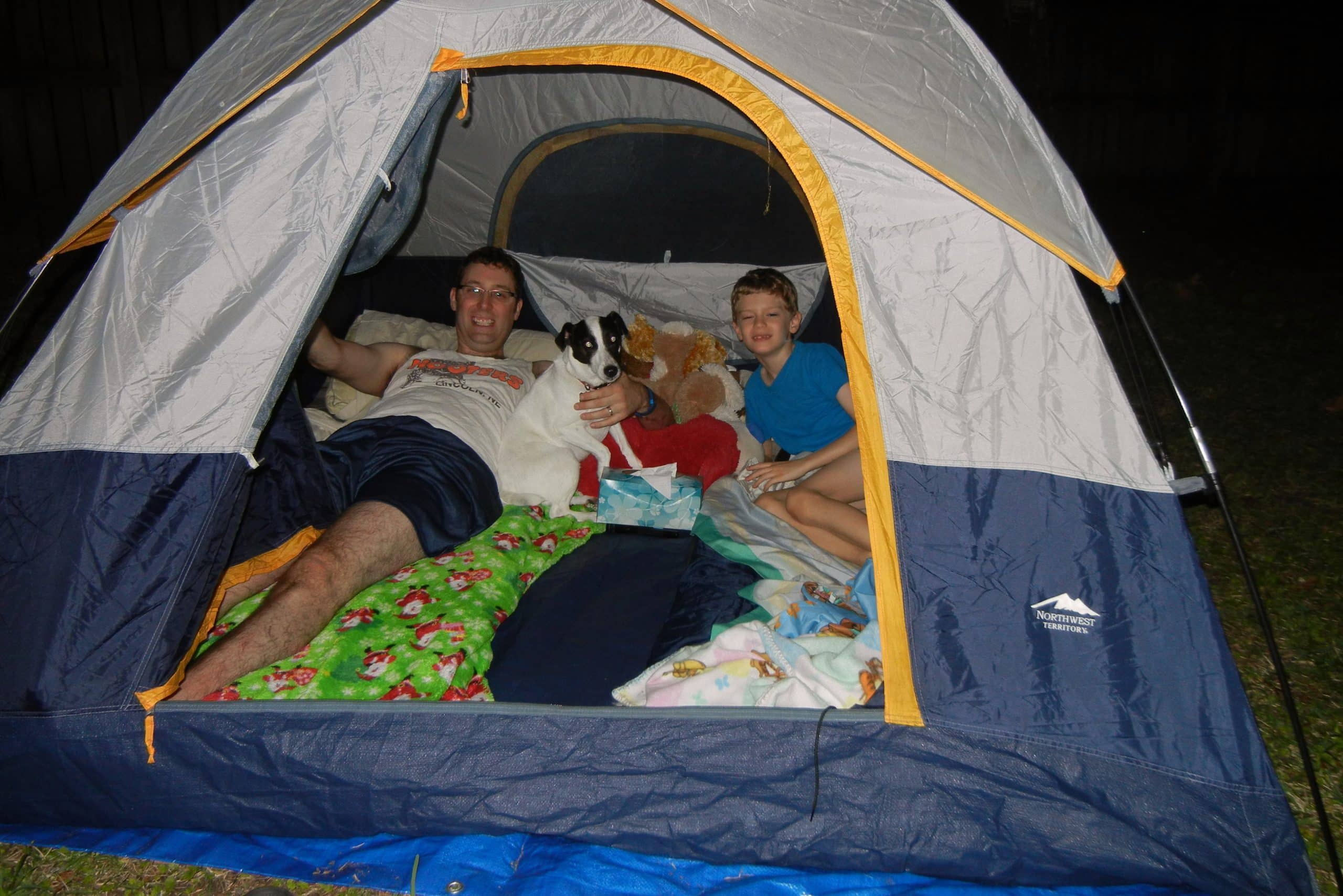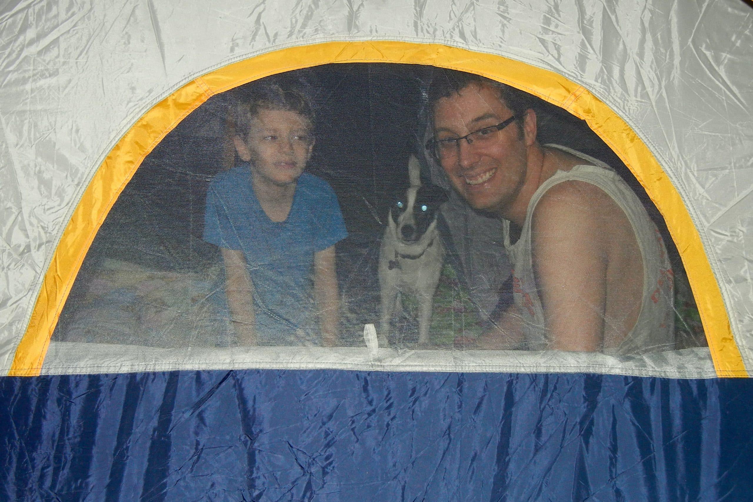 Finally, as it approached bedtime, we got the tent completely set up for sleeping in. We both got ready for bed and Mama came and said goodnight to us. Lucy went inside with Mama for the night because we thought she would be too much of a disturbance to our sleep. By about 9:30pm it was lights out and we were both asleep almost immediately.