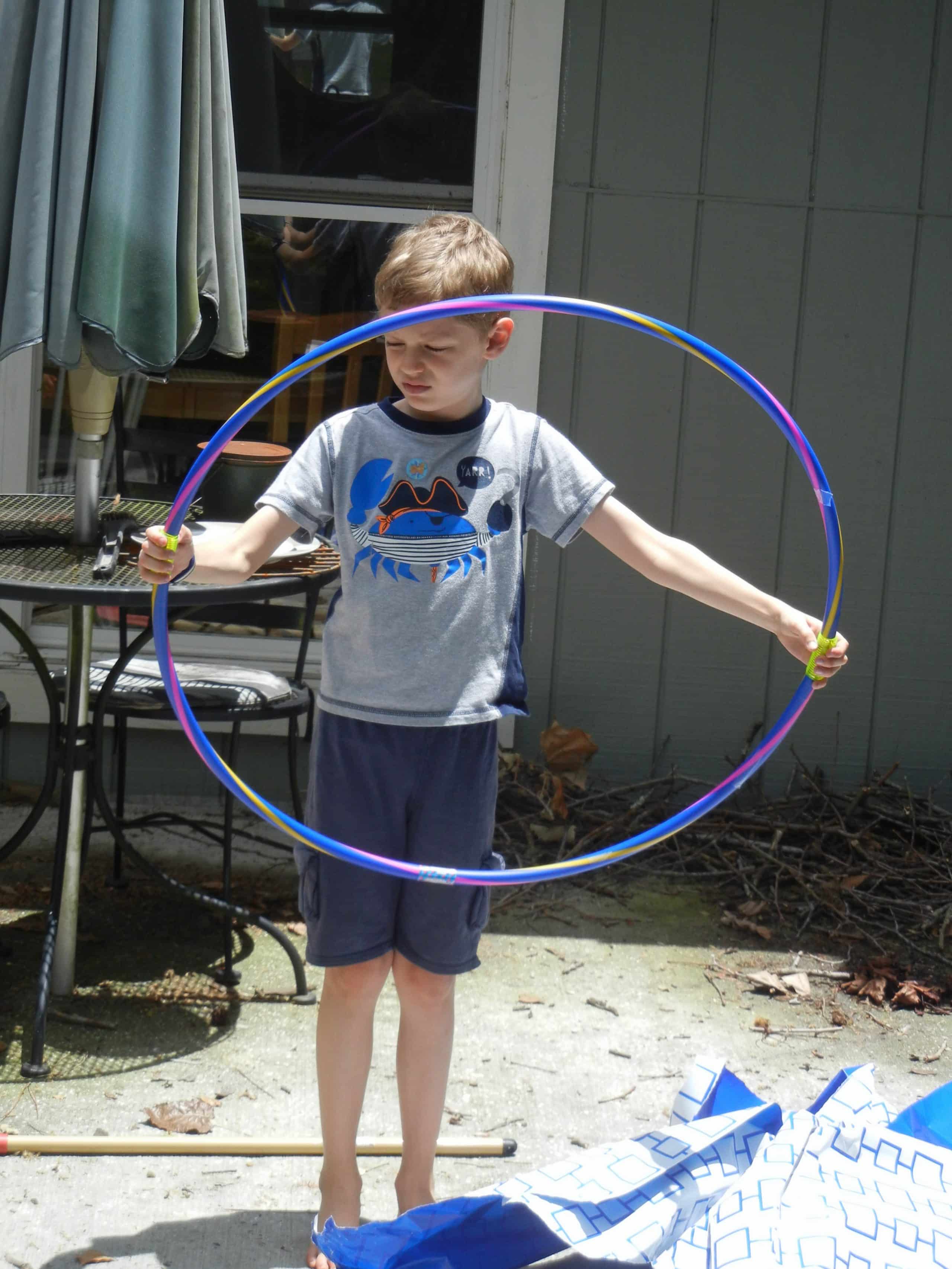 On Saturday morning, Grant went to his gymnastics class and then our friends Tom, Linda, and Taylor came over to eat lunch with us and then play for the afternoon. Grant was very excited that there were more presents to open. Grant had a great time playing with Taylor and his new hula hoop, flying disk, and bouncing disks.