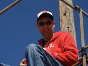 Grant in a tie, 100,000 Miles on the 2007 Dodge Caliber, Smiling Jenna and Towel Hat