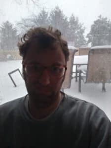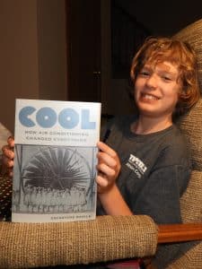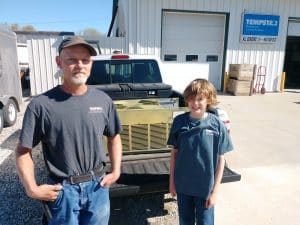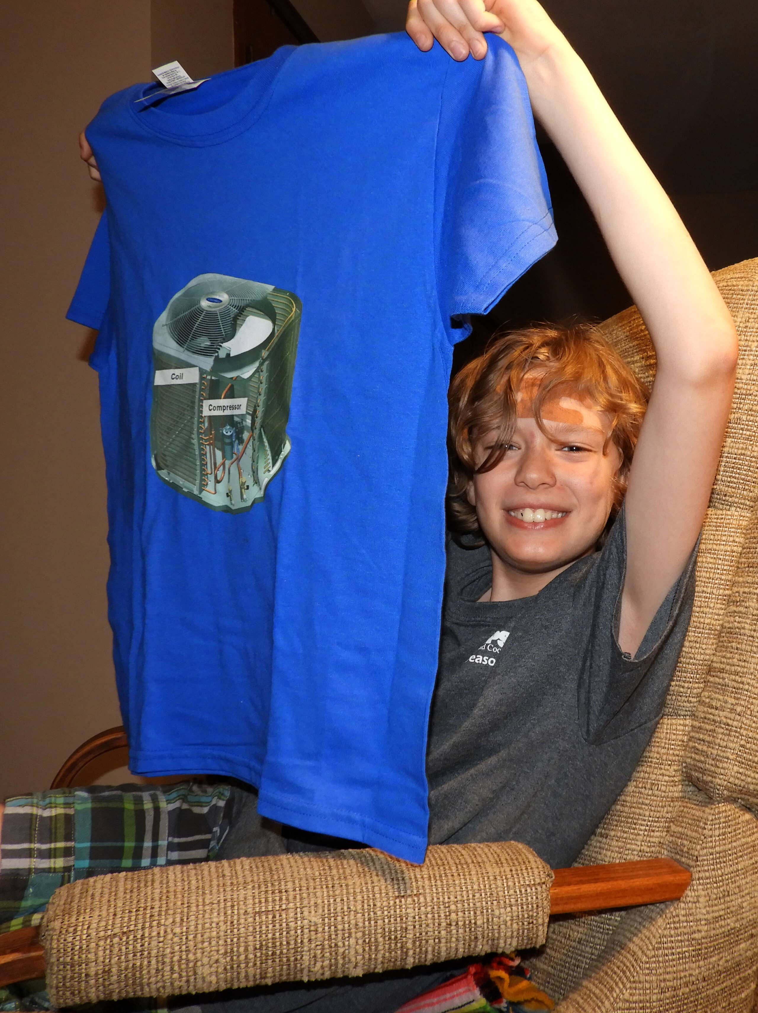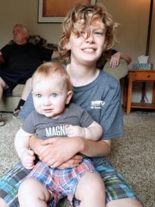 Jenna on the patio, Nate with Jenna and Beckett, Grant and Daisy, Nate and Daisy, and Grant with an Air Conditioning Technician at a business in Beatrice that he toured and got an old AC to play around with (HVAC is a current interest of Grant’s)