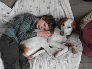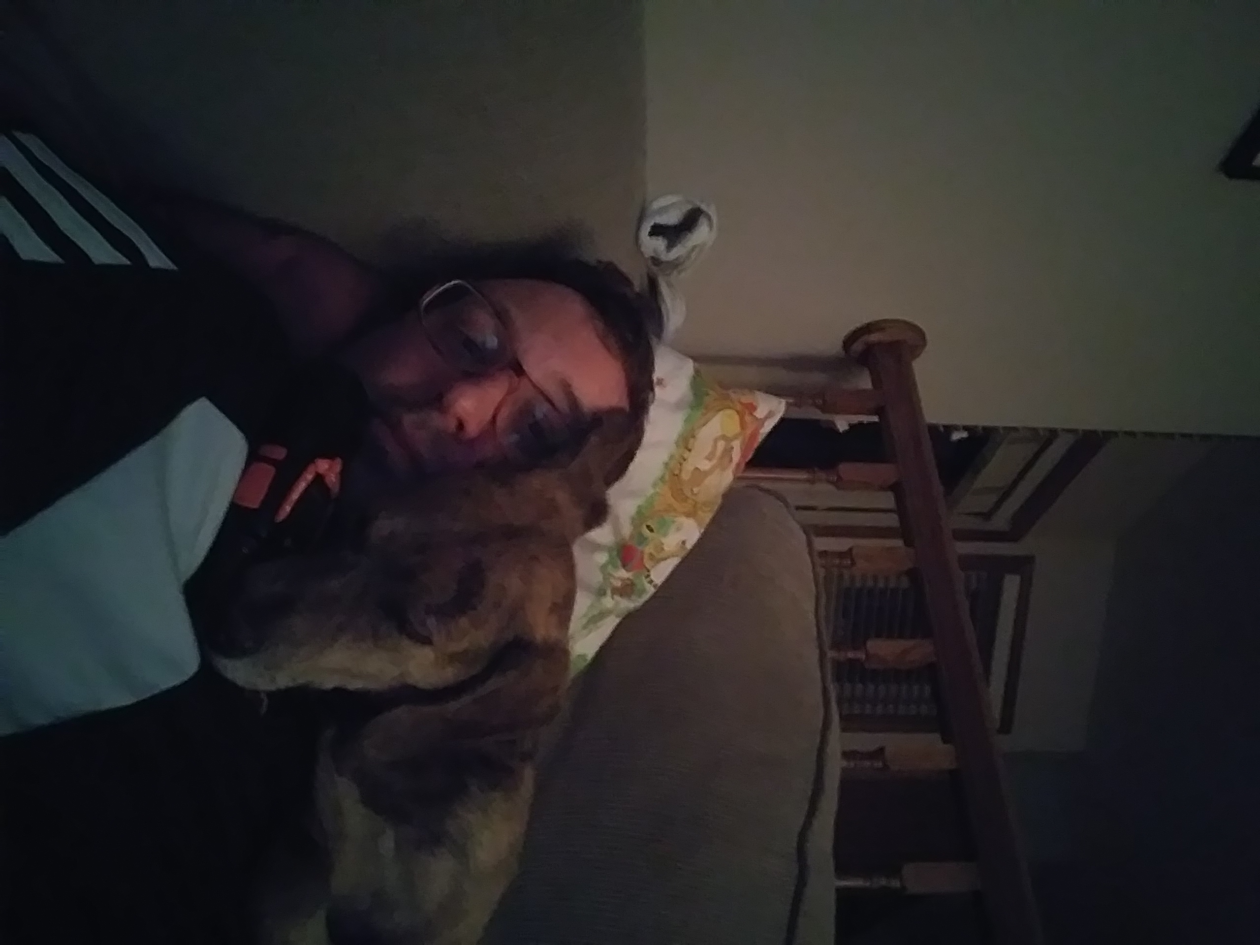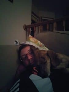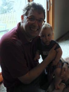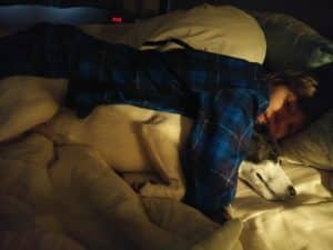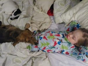 Grant’s crazy hair, Grant cuddling with Lucy in bed, Grant and Lucy, and Jenna happy at dinner.
