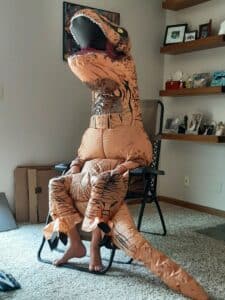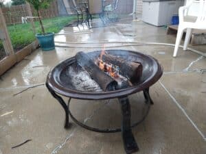 Super Daisy, Lazy Daisy, a firepit in the rain and a dinosaur in a chair.