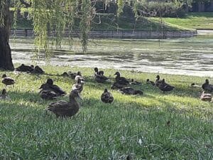 Ducks along a neighborhood walking path, Jenna pretending to sleep and Nate and Jenna being silly.