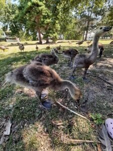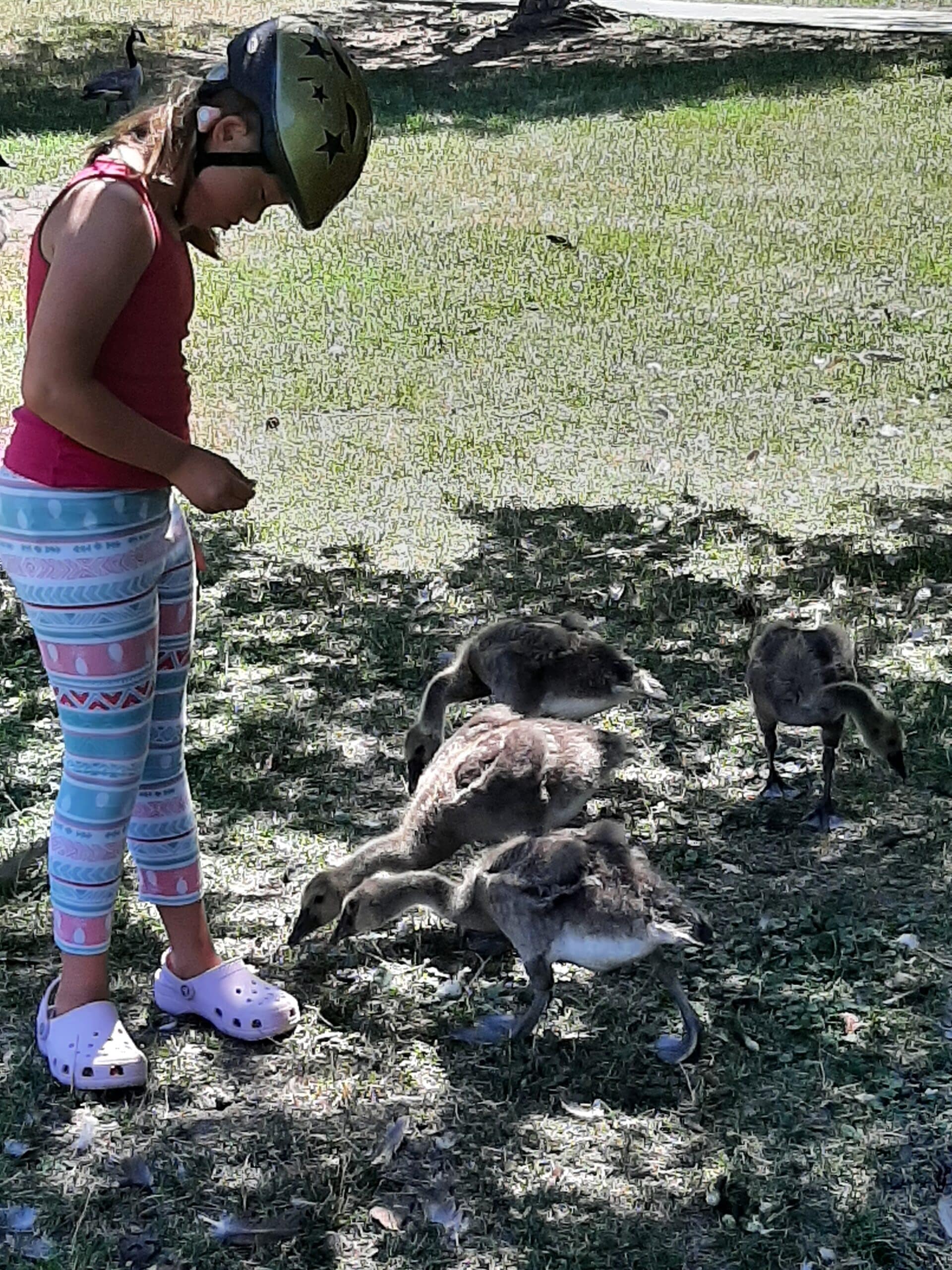 Jenna in a dress Nana made, Apple Fritters, Jenna feeding Geese (and babies) and cute dogs laying on each other.