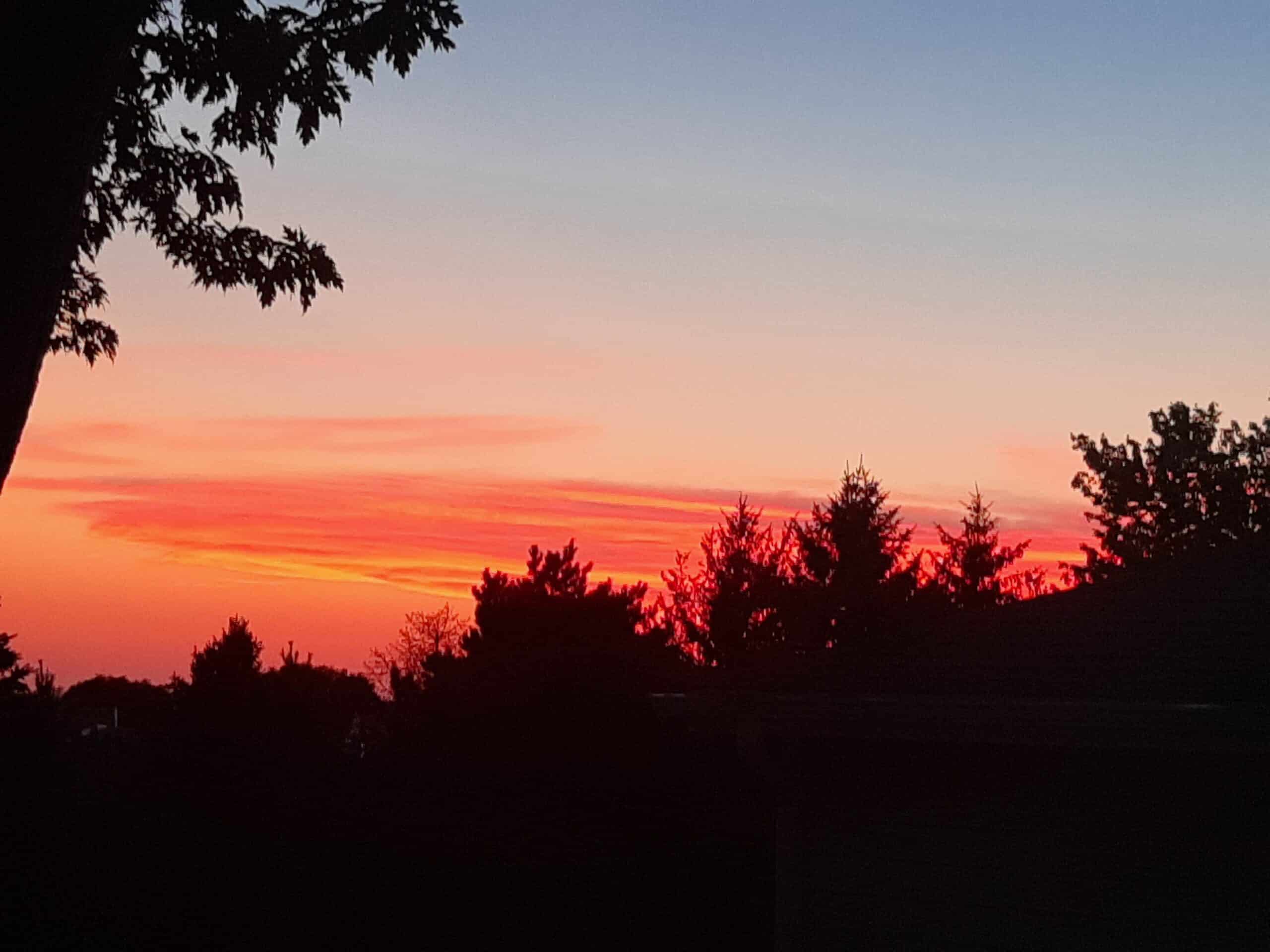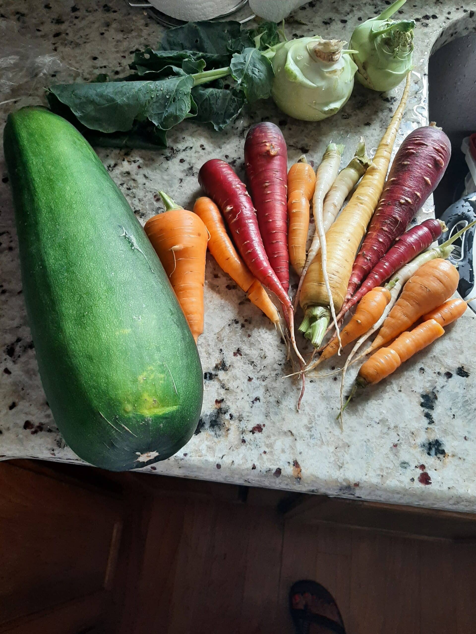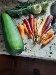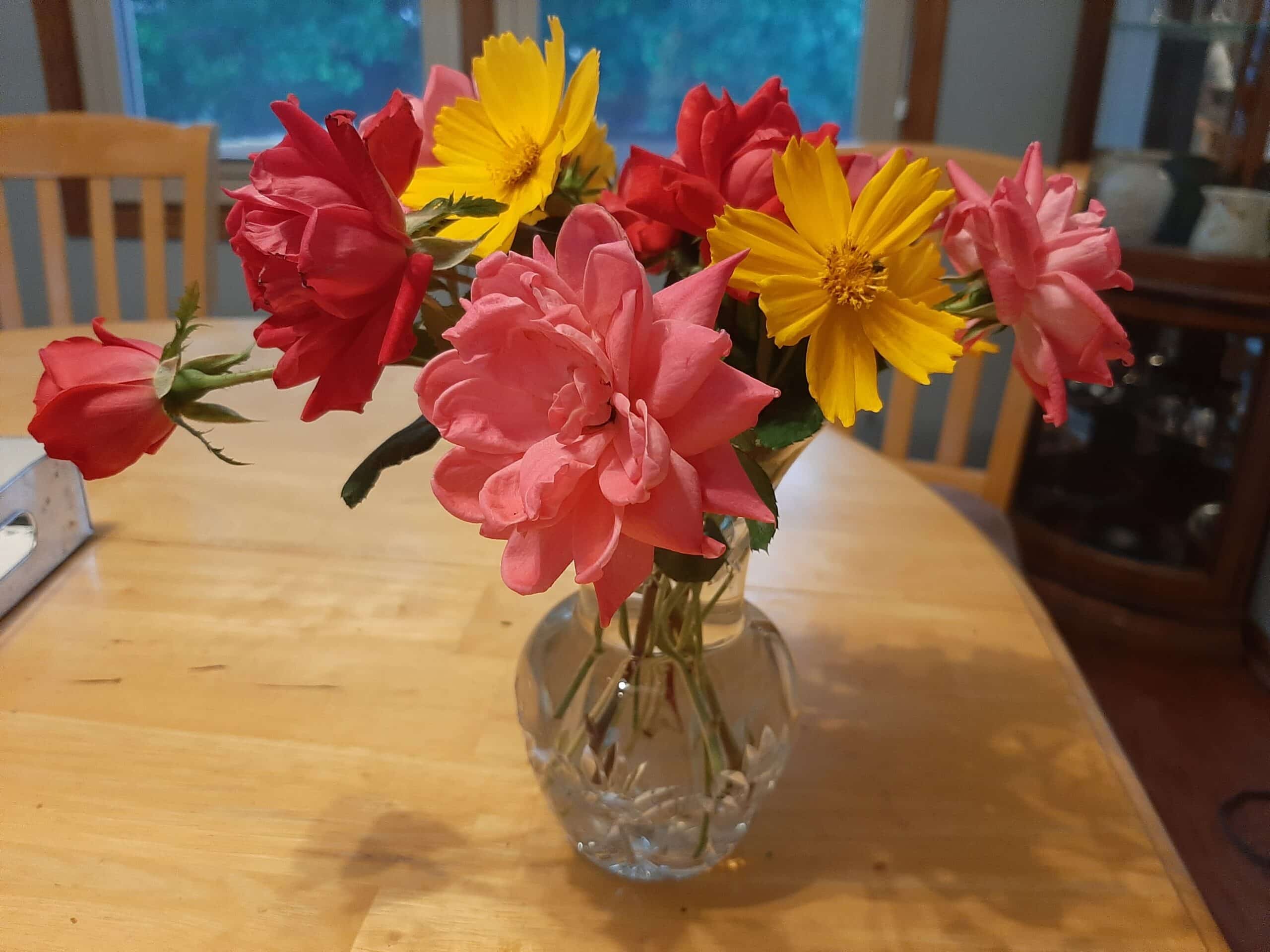 Flowers and Veggies from the Garden, a Sunset, Praying mantis, Carol’s haircut, Jenna’s braids and Carol lounging with Josie.