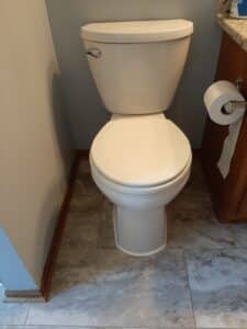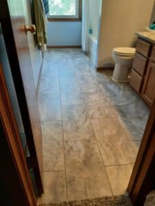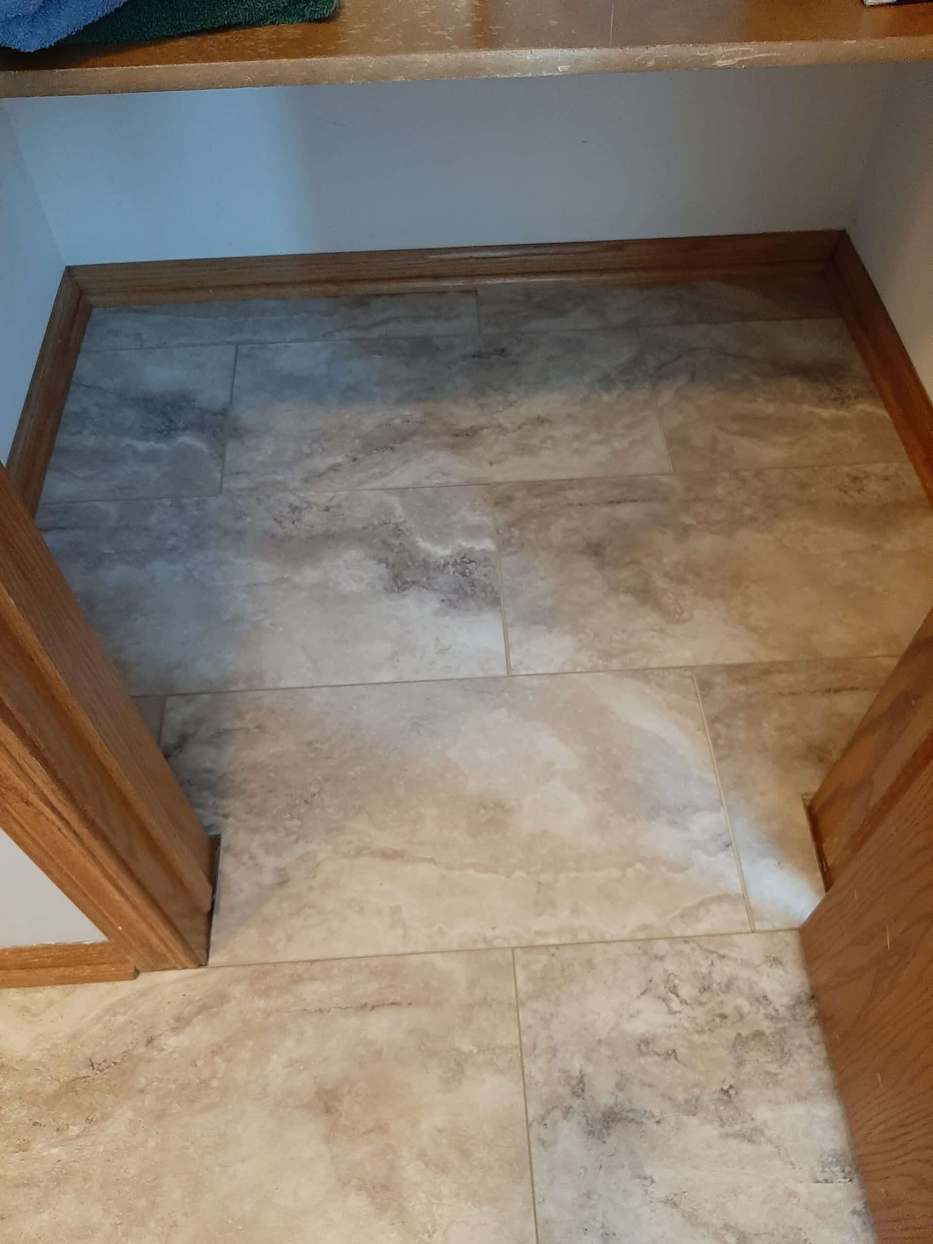 We decided to tear up the old linoleum and replace it with a laminate flooring that looked like tiles. We also installed a new toilet. Carol did a great job on the project!