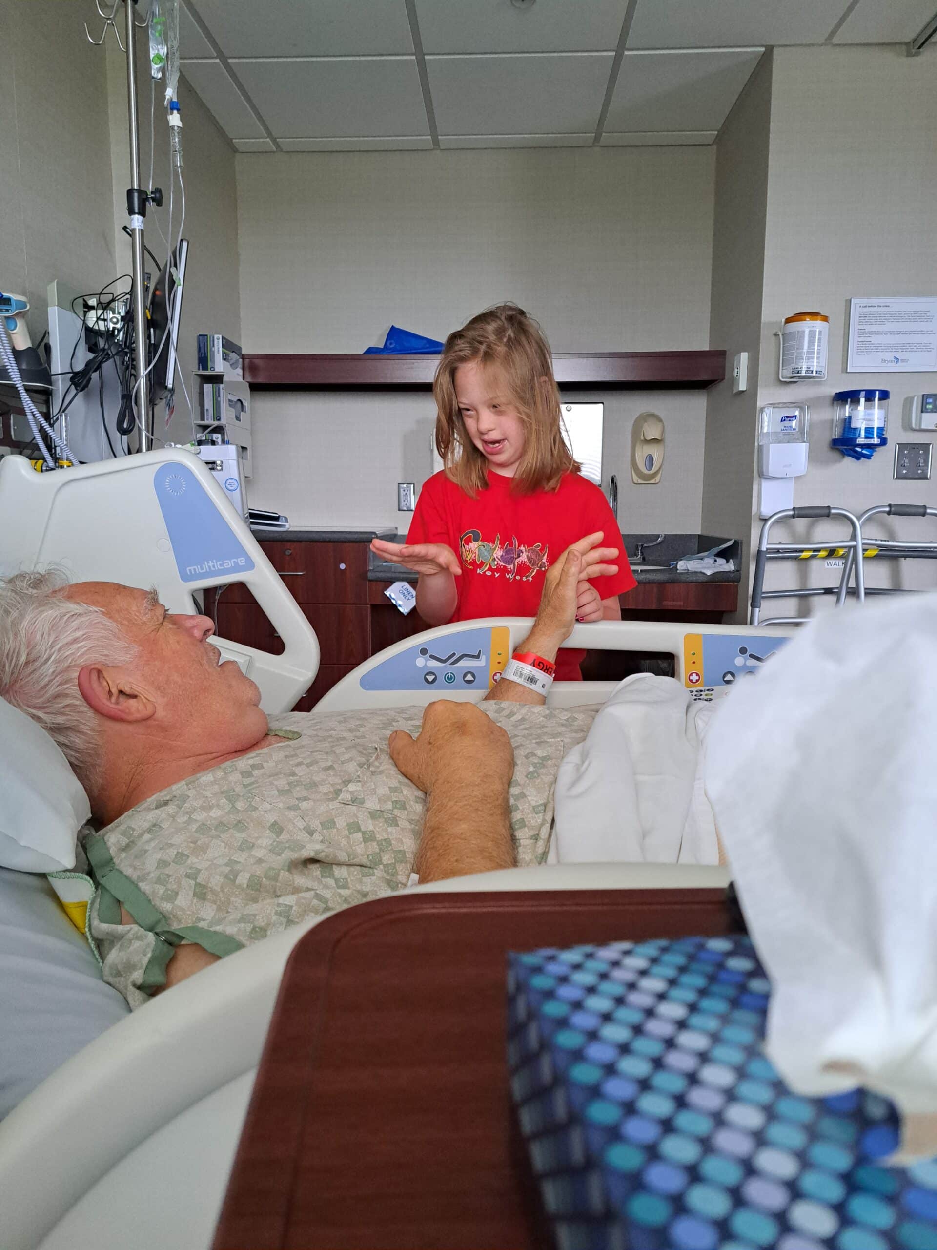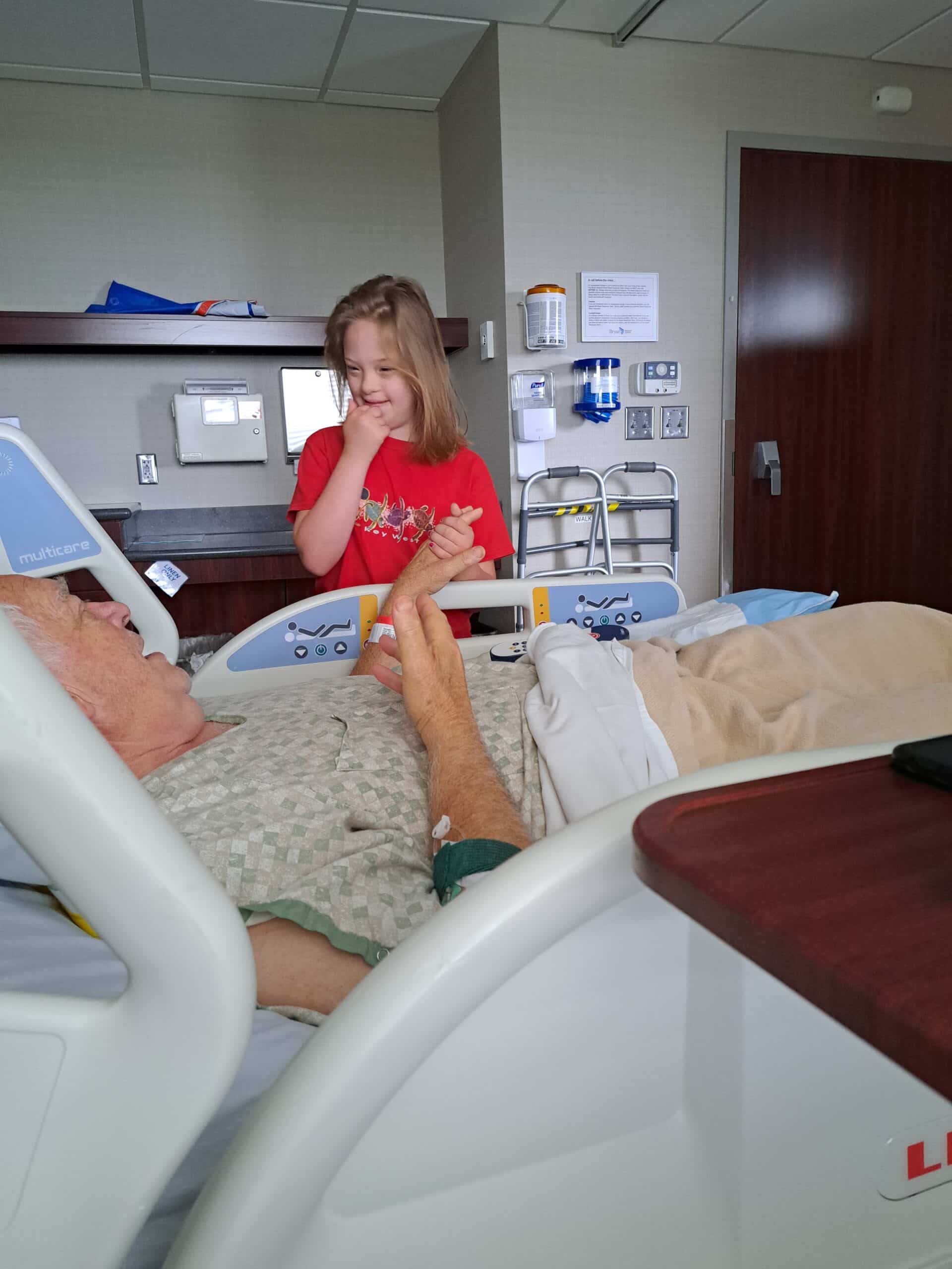 Nate’s Dad had been putting off surgery to fix several hernias and finally got it done in July 2023. Jenna was a little afraid to visit him in the hospital because she wasn’t sure he was ok. After doing a video call with him, she decided it would be safe to visit him. While there, she tried to comfort him. It was very cute!