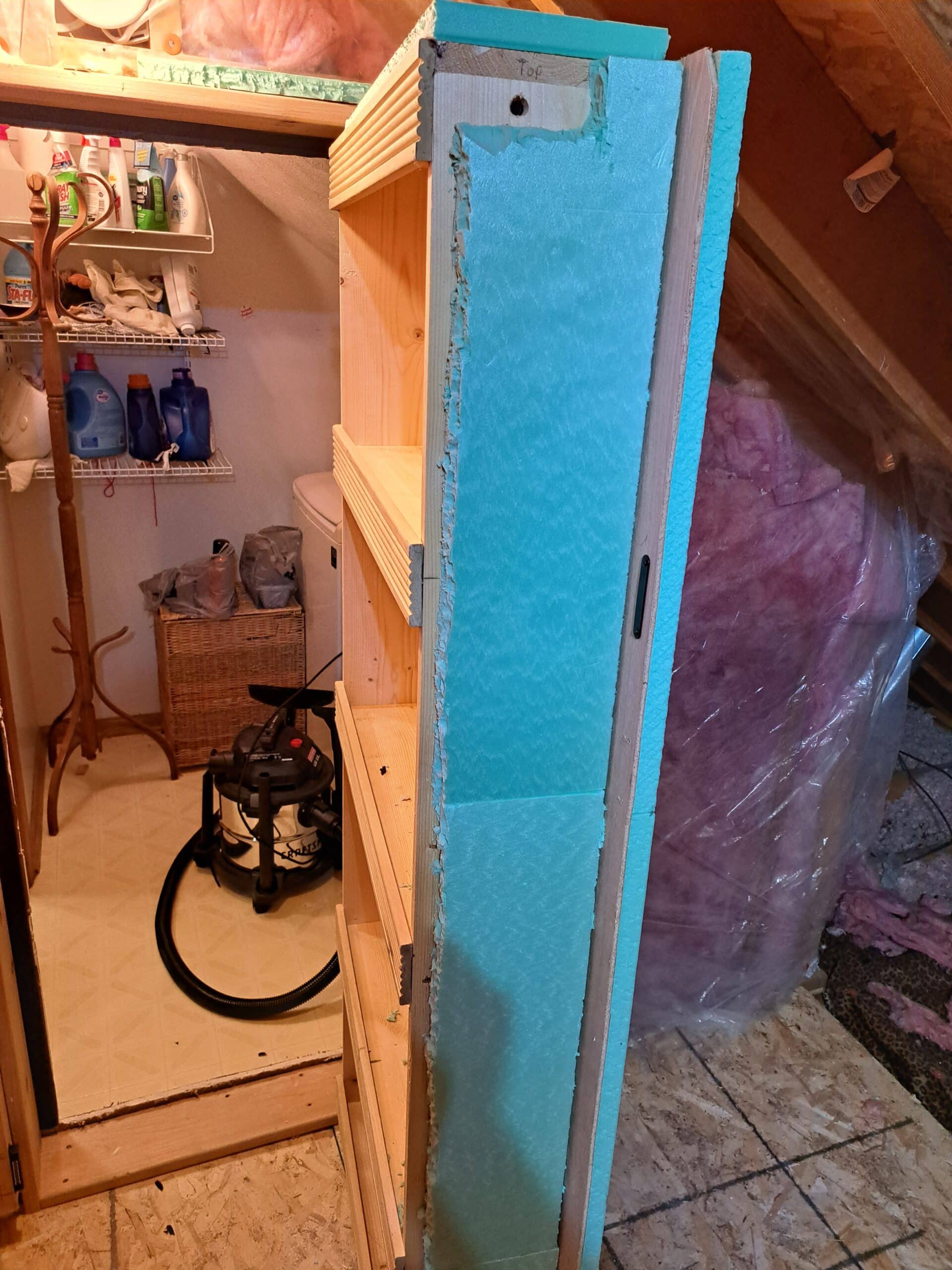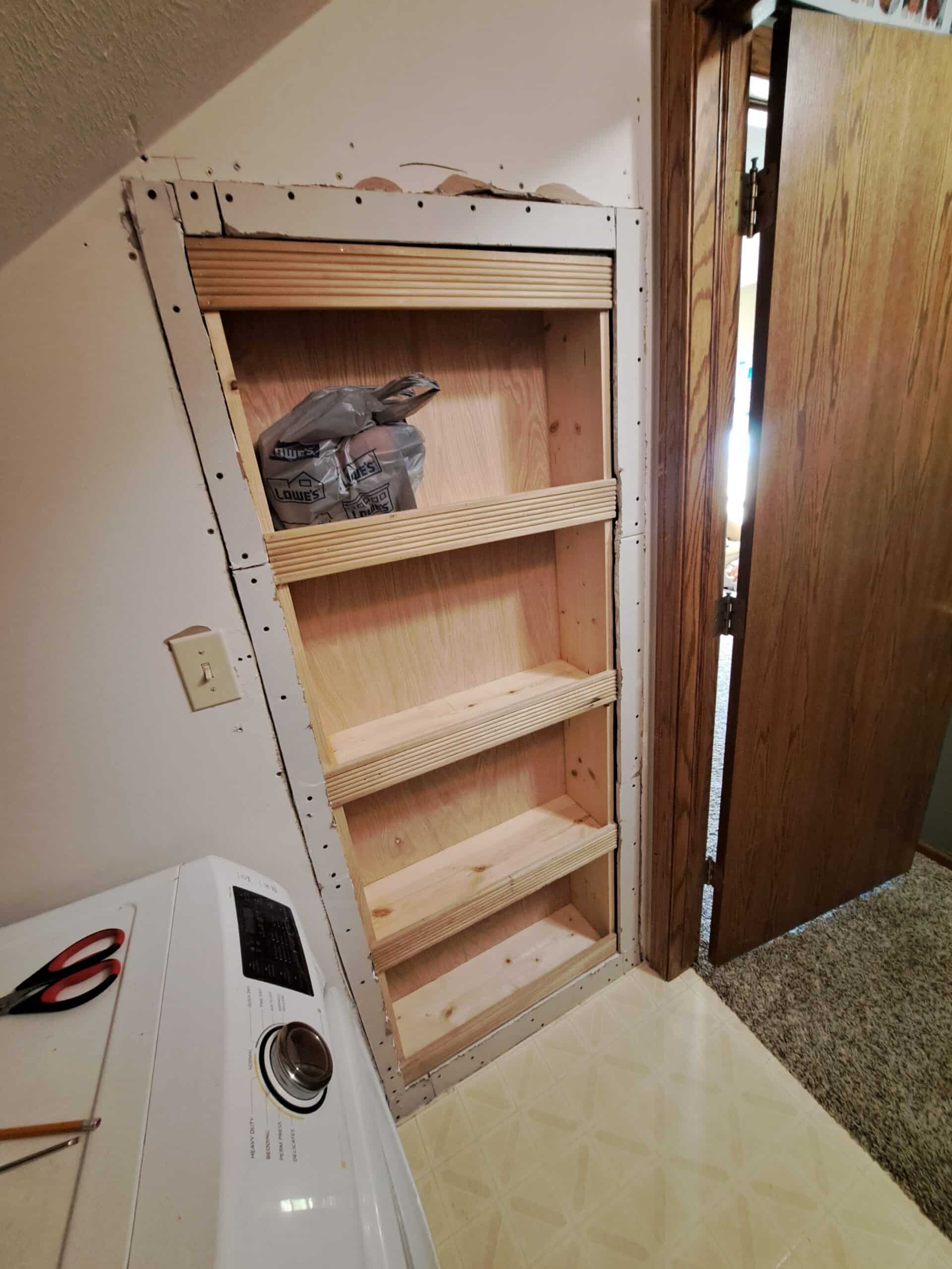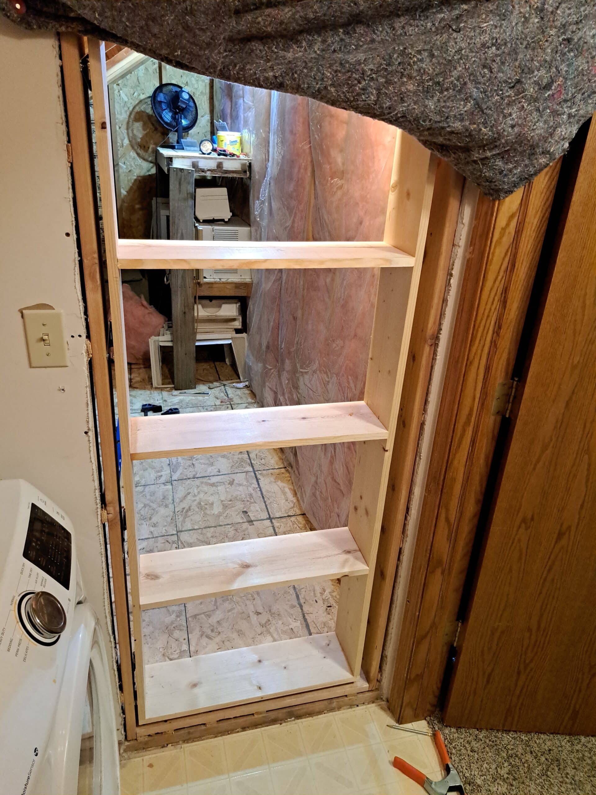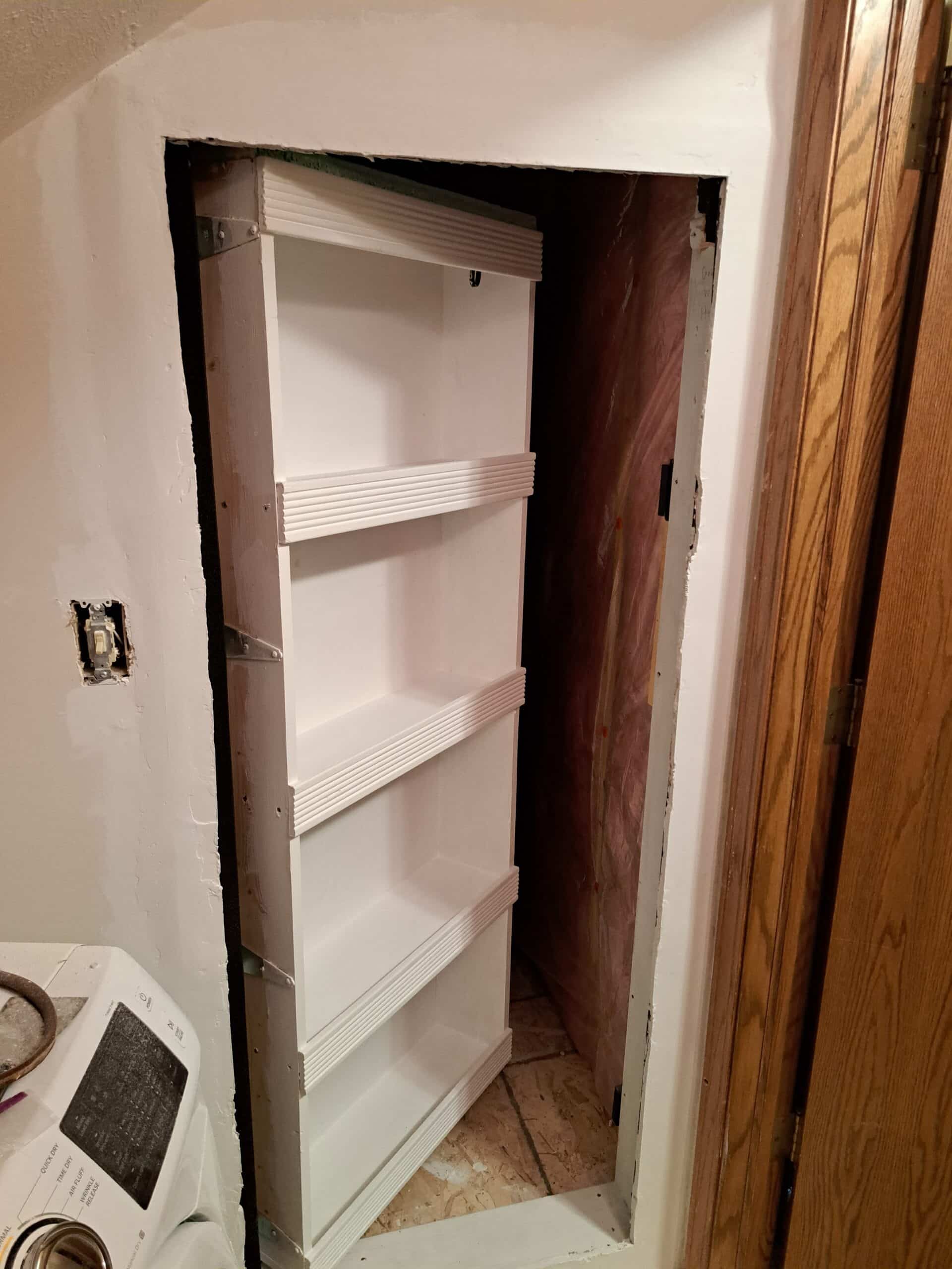 Grant has a storage area in our attic for some of his old air conditioners that he has fixed up. To access the area, it was previously just a small opening that he would have to crawl through after removing a painted piece of wood that was screwed into the wall. He and Nate realized that the opening could be opened up wider, so they came up with the idea to make a swinging door that looked like built-in shelving. They built it, installed it, insulated it and did finishing work on it over several weekends. Now when Grant needs to get into his storage area, he just has to undo the hidden lock and push the door open.
