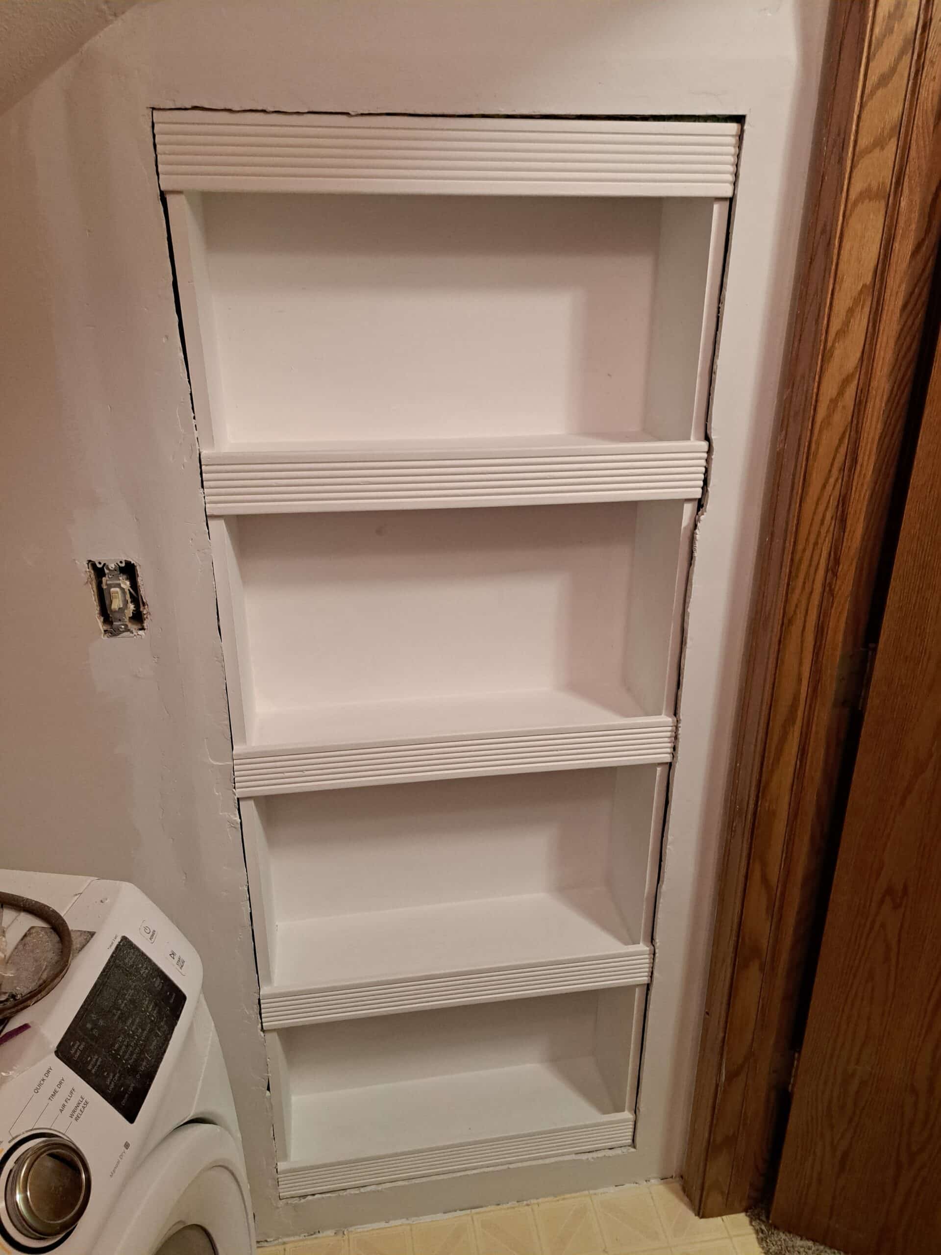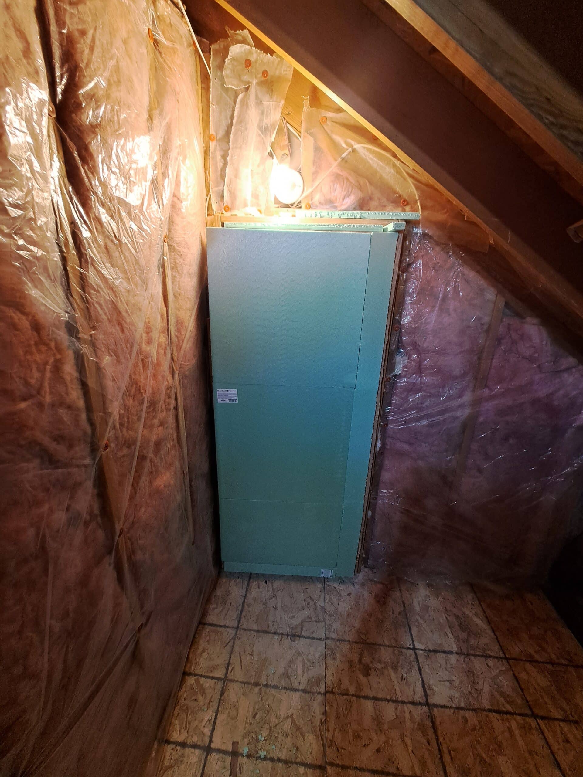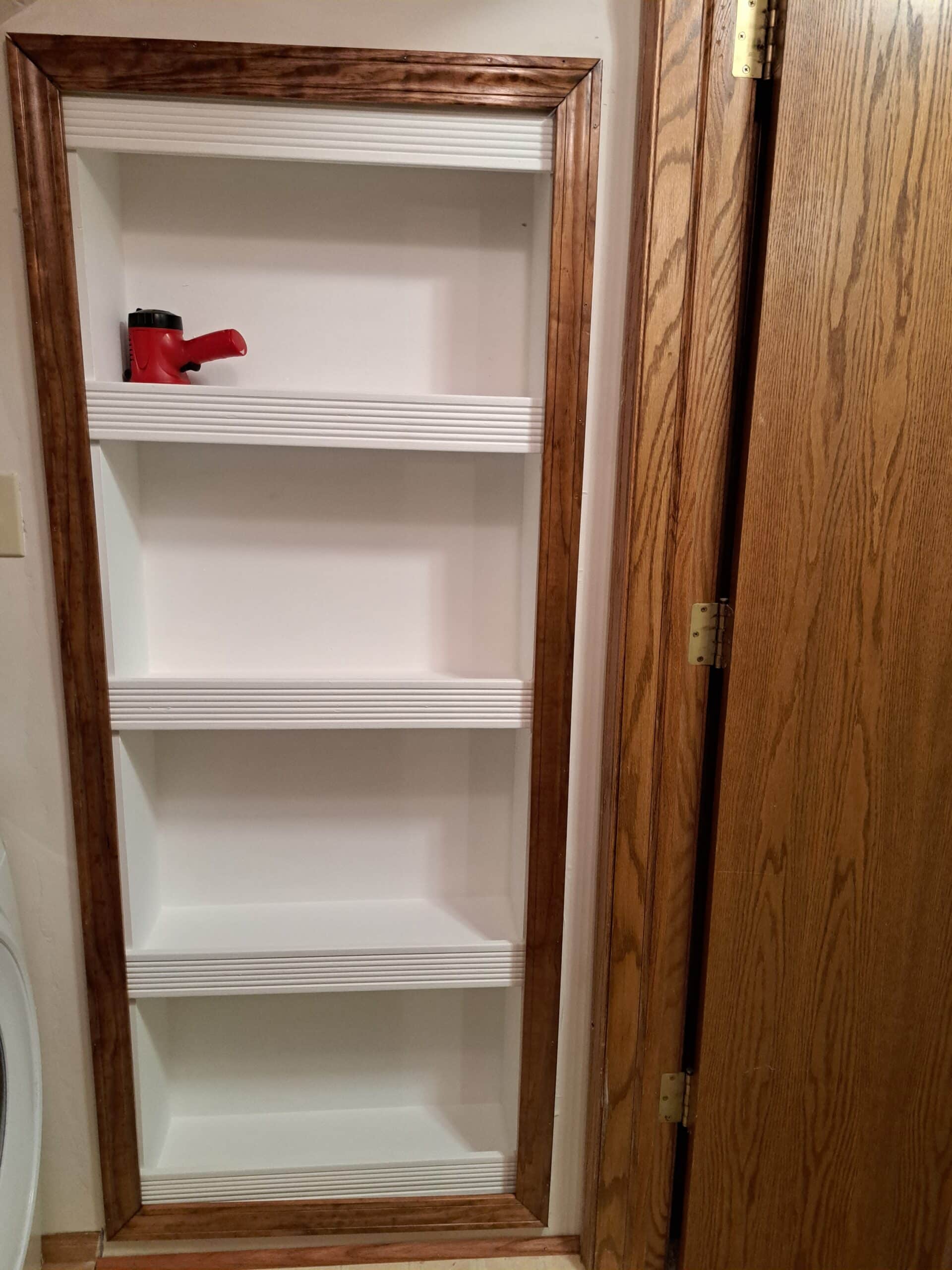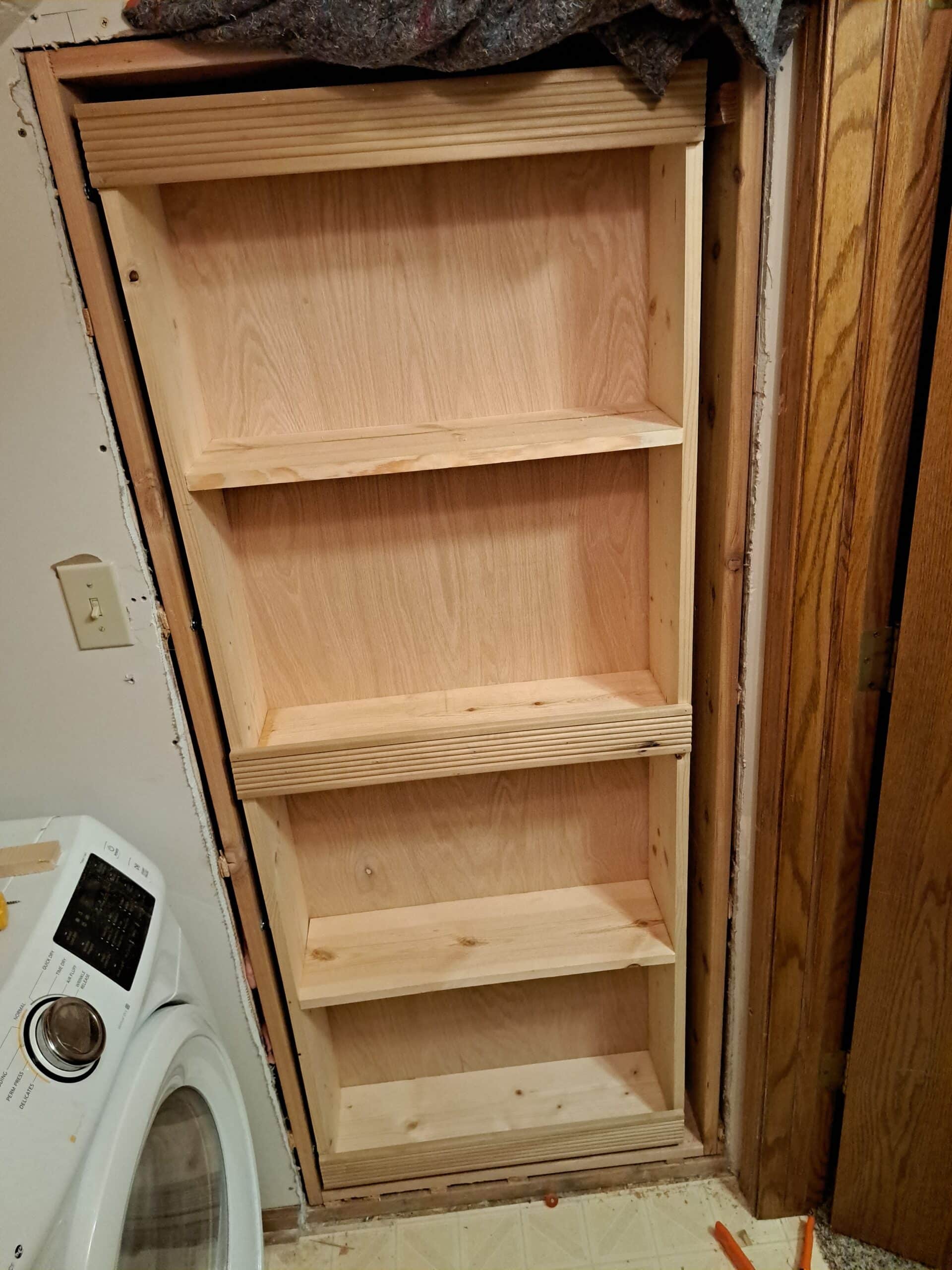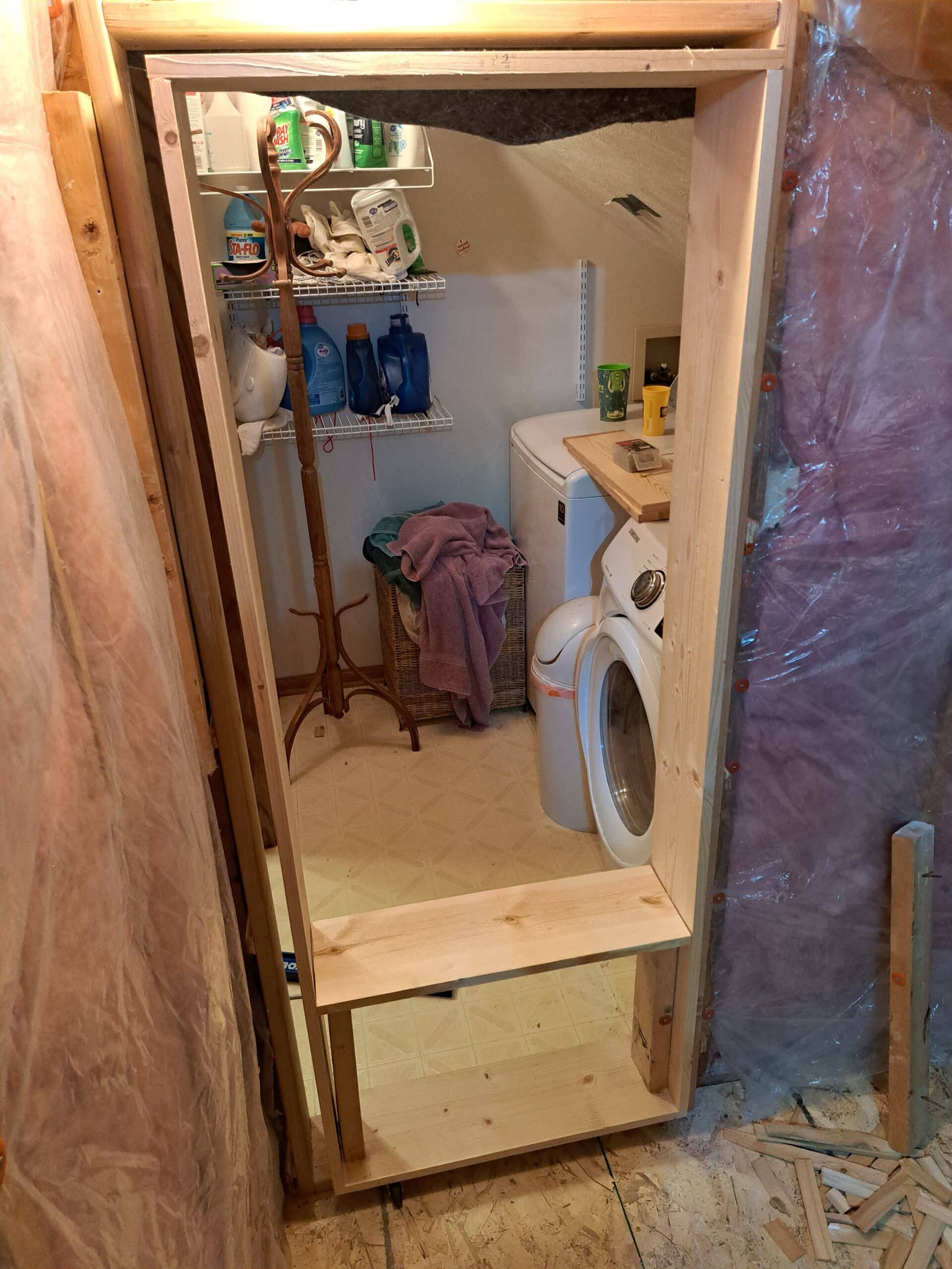 Grant has a storage area in our attic for some of his old air conditioners that he has fixed up. To access the area, it was previously just a small opening that he would have to crawl through after removing a painted piece of wood that was screwed into the wall. He and Nate realized that the opening could be opened up wider, so they came up with the idea to make a swinging door that looked like built-in shelving. They built it, installed it, insulated it and did finishing work on it over several weekends. Now when Grant needs to get into his storage area, he just has to undo the hidden lock and push the door open.
