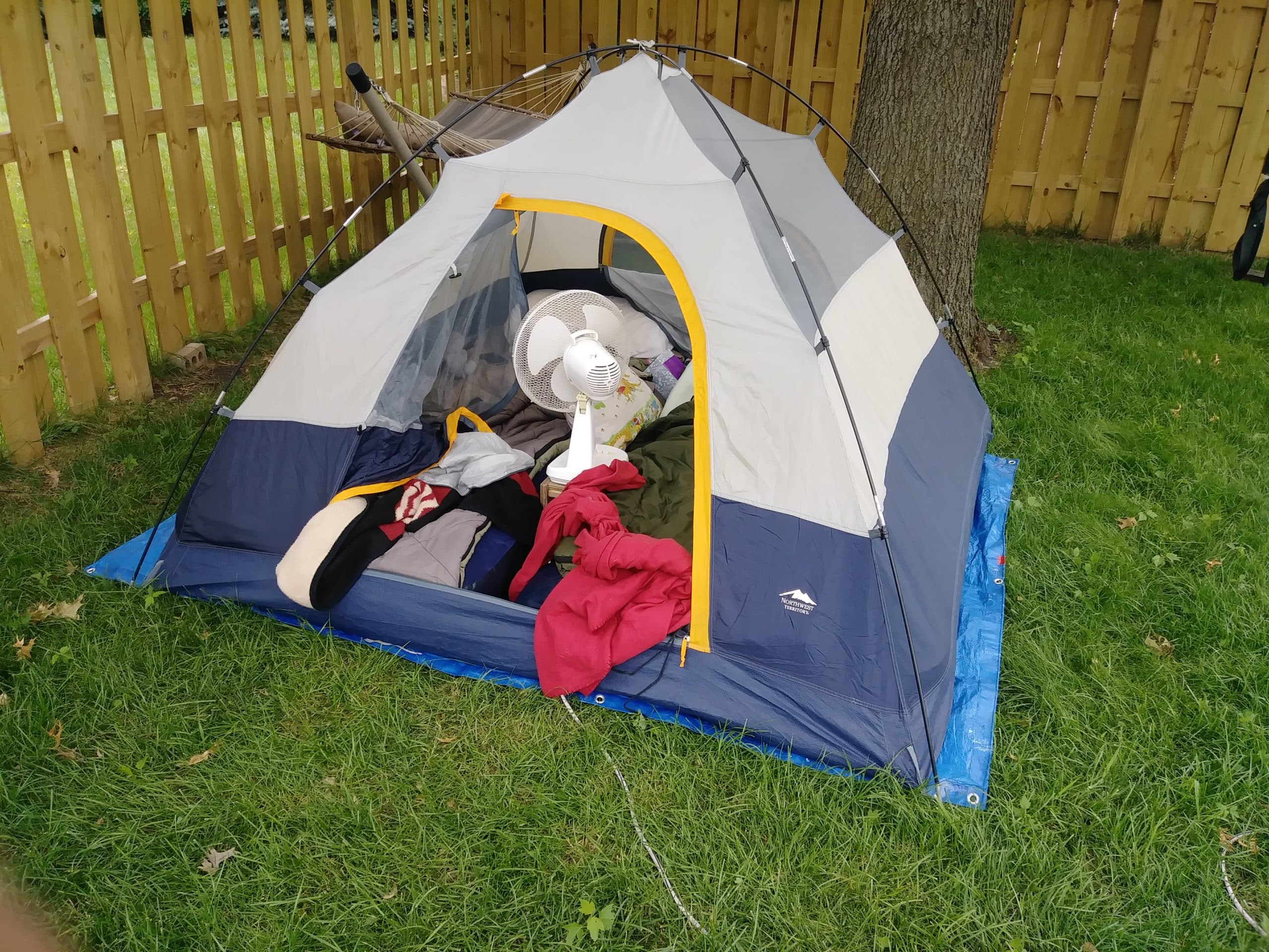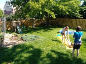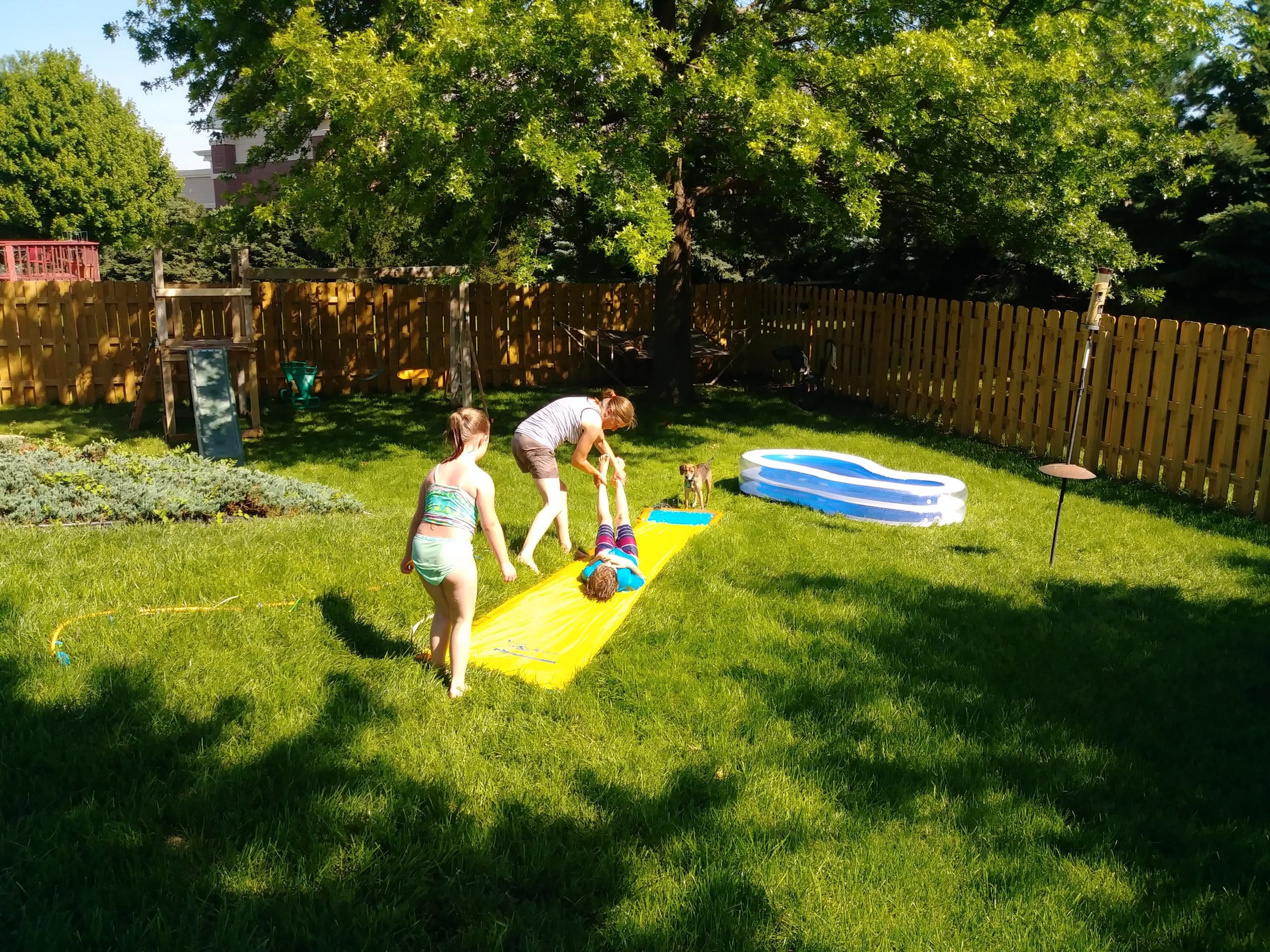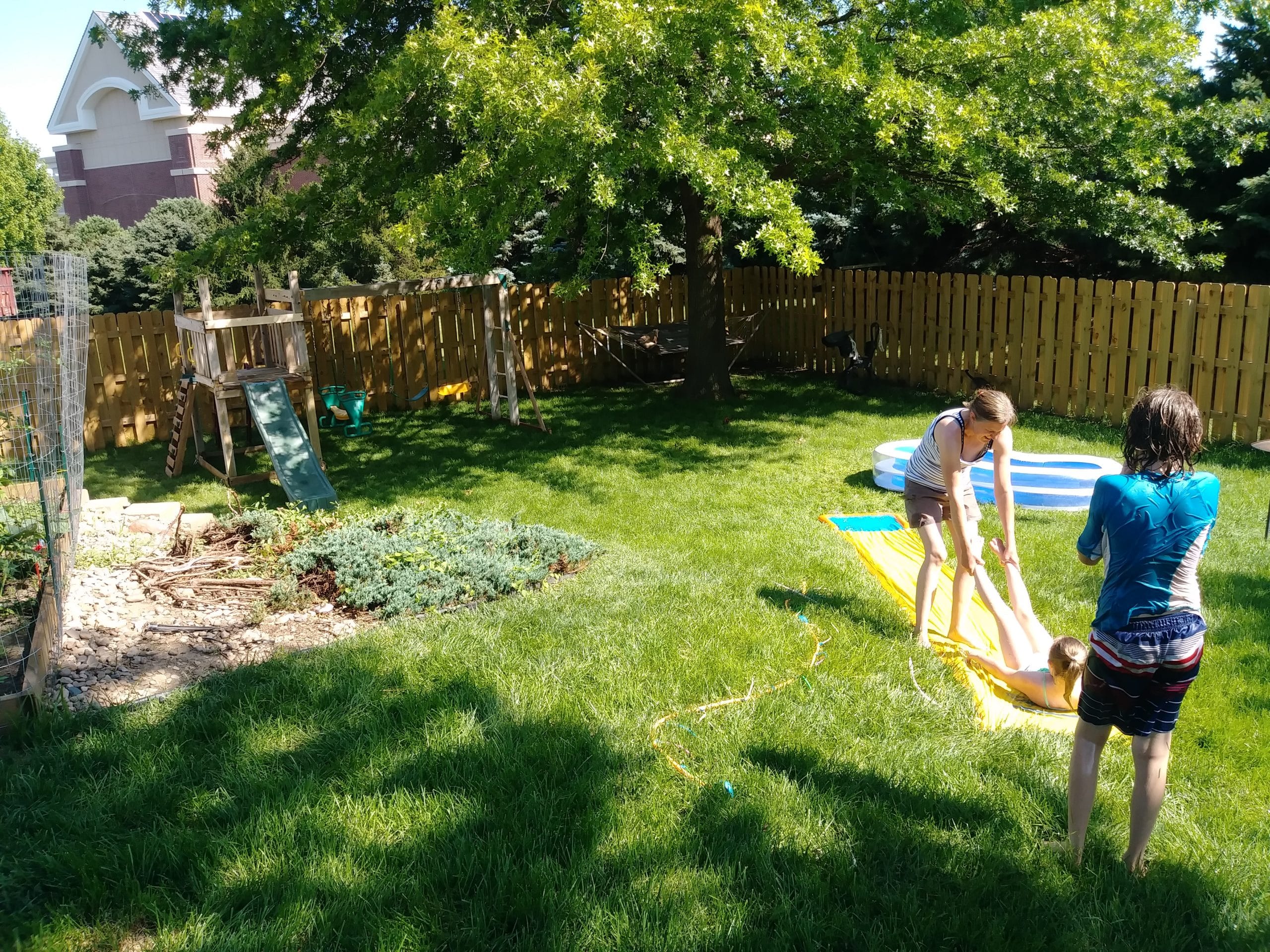 Grant and I decided to sleep in the backyard again this year, like we had for a previous birthday of his. This year we upgraded our sleeping arrangements by using blow-up mattresses and even ran an extension cord out to the tent so that we could run a fan. The kids also had fun setting up the slip-n-slide and going down the hill.