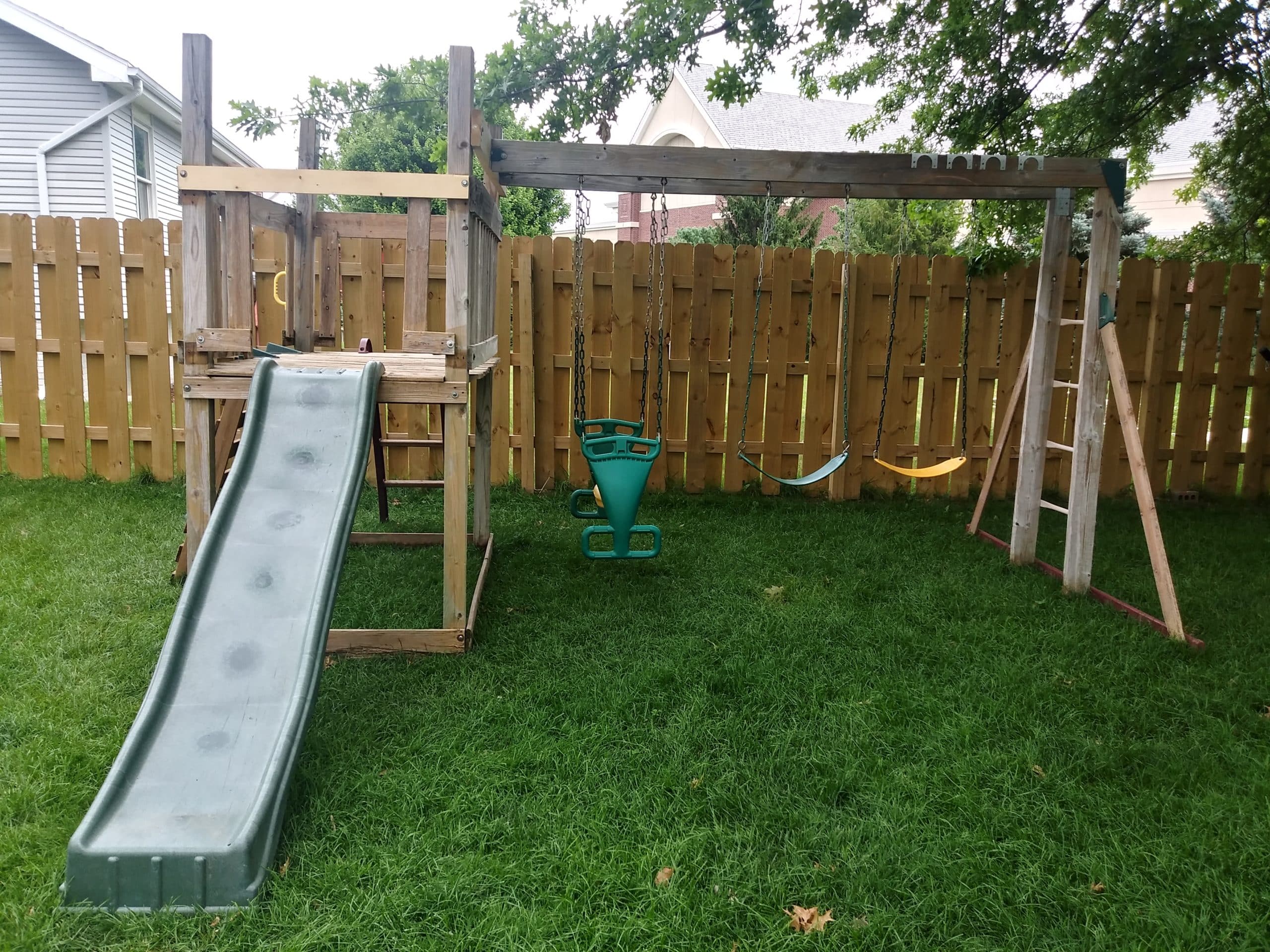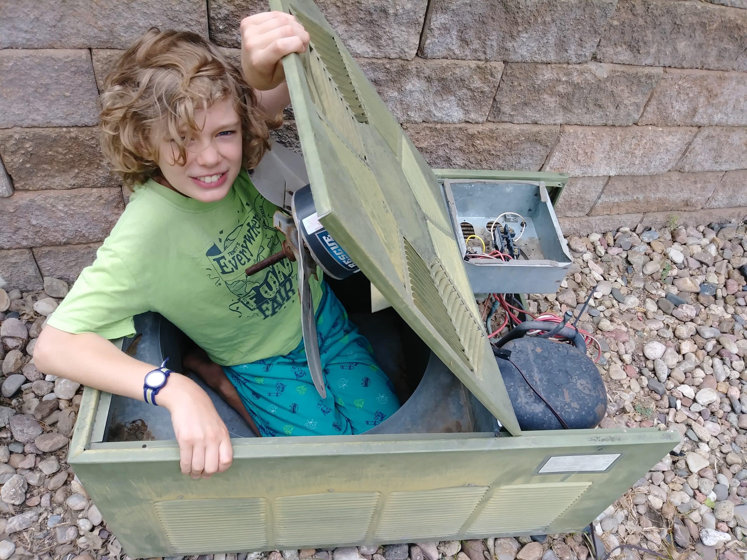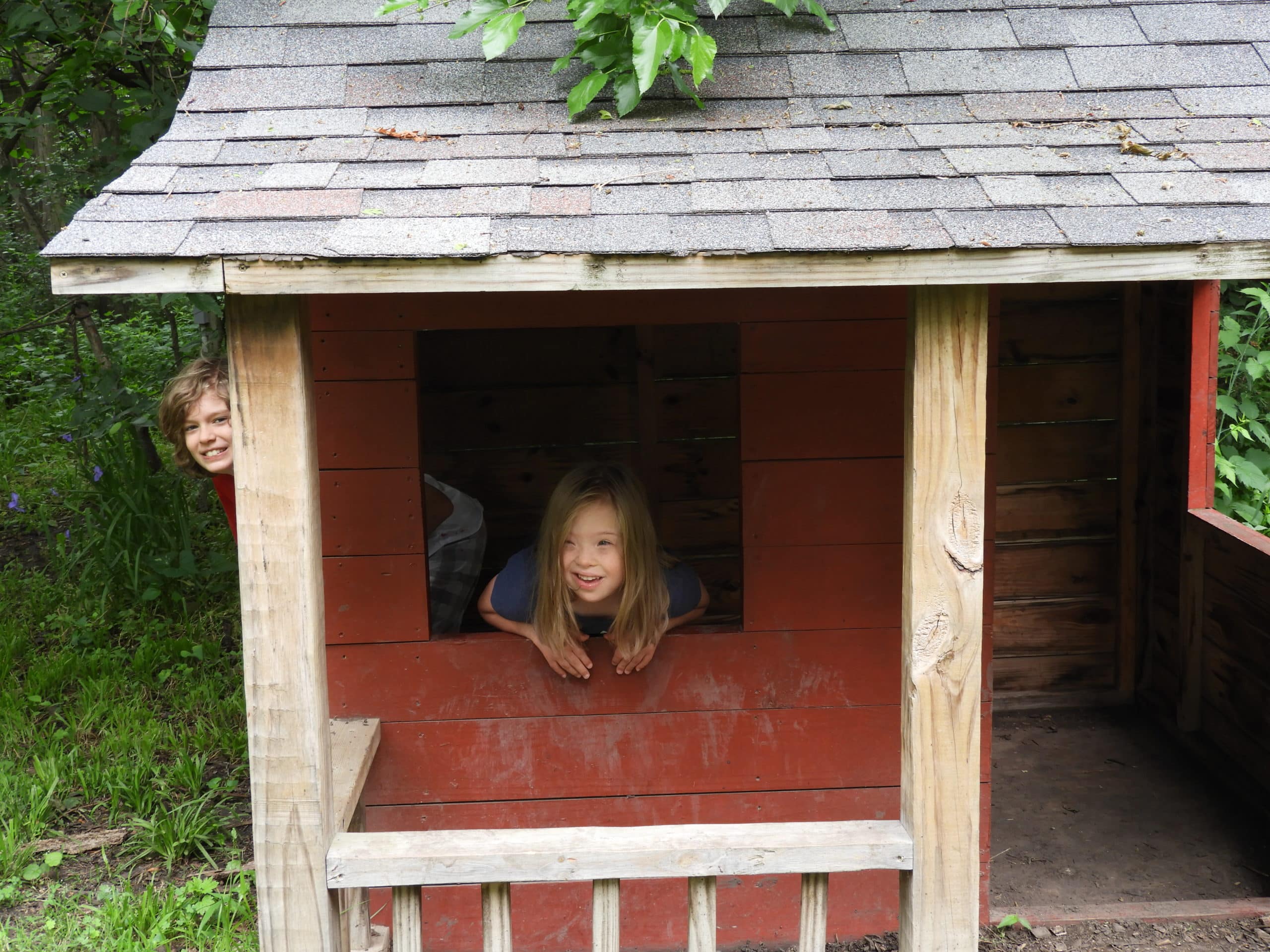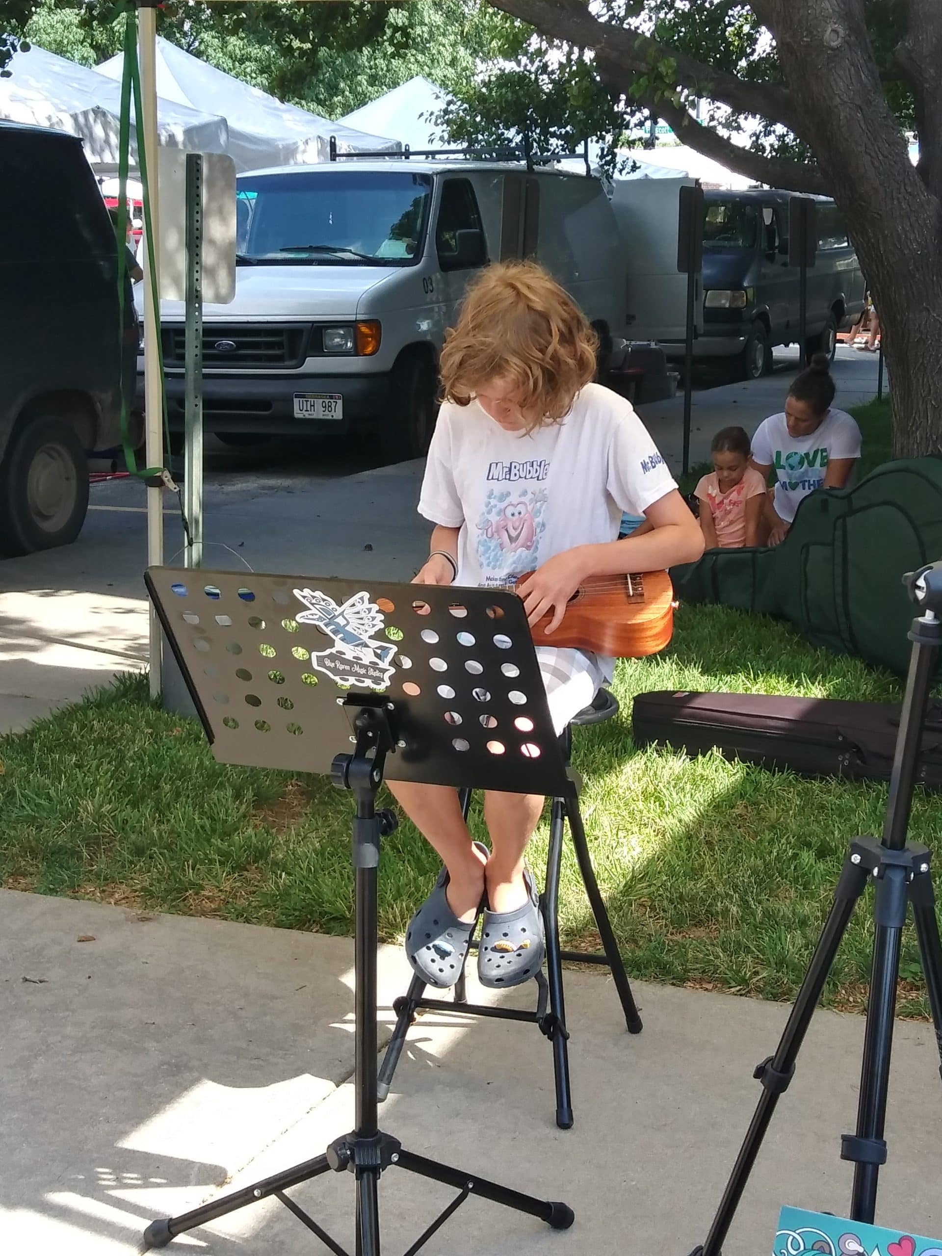 Grant in an AC unit, the new playground equipment in the backyard, Ukulele playing, Jenna in a wig and video of Ukulele playing.