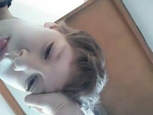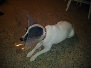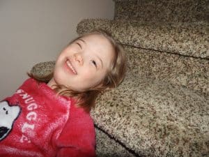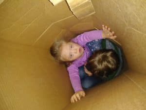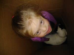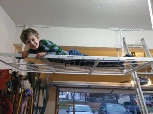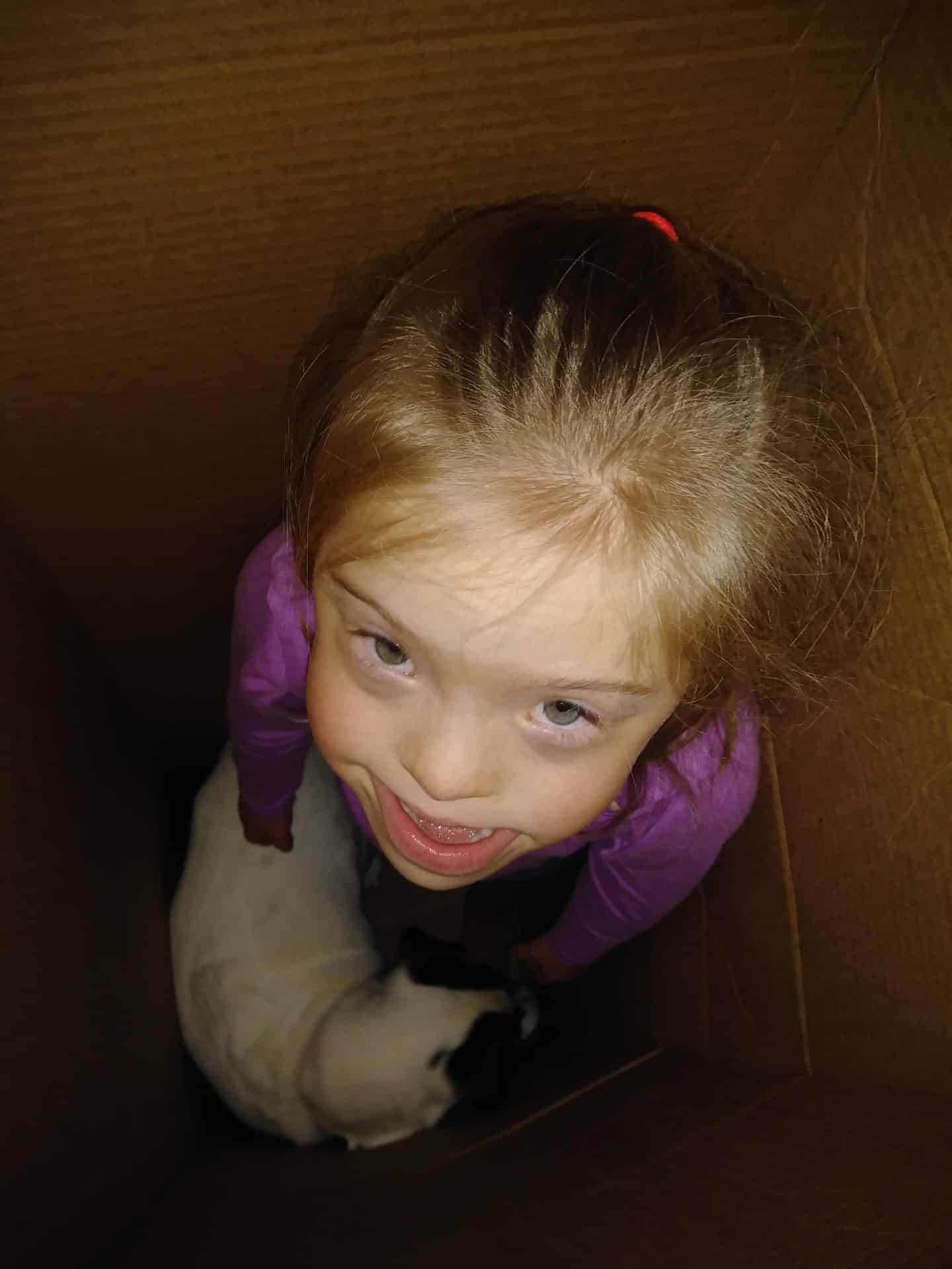 Jenna on the stairs, Grant on the stairs, Jenna and Dad clowning around, Lucy wearing the cone (because she had a leg sore she wouldn’t leave alone), Grant selfie, Jenna and Lucy in a cardboard box, Jenna and Grant in the box, Grant testing out the ceiling-mounted storage shelves in the garage, and Nate celebrating Purple Shirt Thursday.