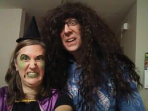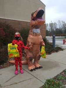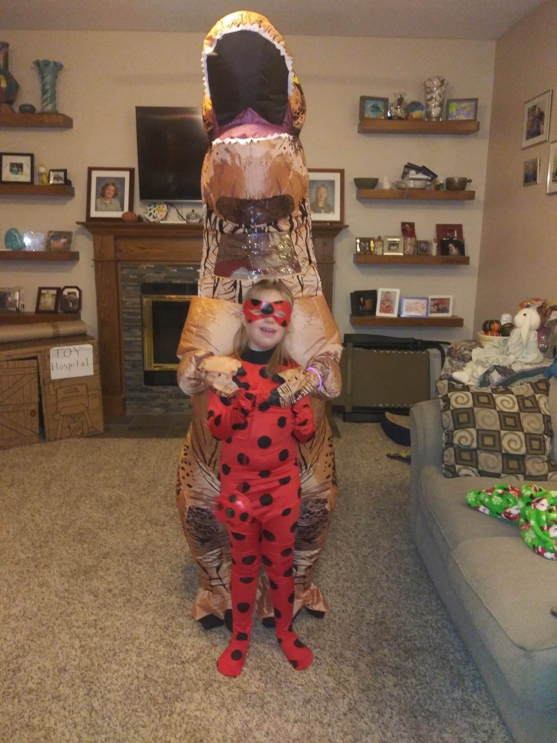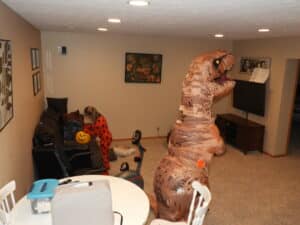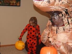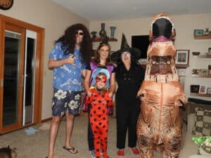 We enjoyed a different kind of Halloween this year. Nana came for a visit and we did a drive-up trick-or-treat at our church. We also did some pumpkin carving. But actual Halloween was not the typical walking the neighborhood. Instead we hid candy in the basement and had the kids look for it while wearing their costumes. Grant was a dinosaur and Jenna was a superhero named Ladybug. Nana and Carol went as mother and daughter witches. And I went as a surfer dude, though I was mistaken for Weird Al Yankovich.