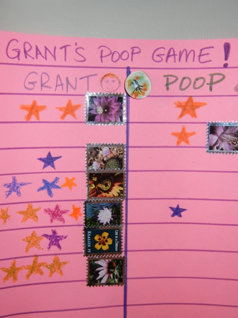 Each day, Grant and Poop square off in a battle and whoever gets the most stars wins the day (ties go to Grant). Poop gets a star if Grant wakes up with poop in his diaper, but Grant gets a star each time he puts poop in the potty. The Grant vs Poop game has been going on for over a week now and Grant is doing REALLY well.