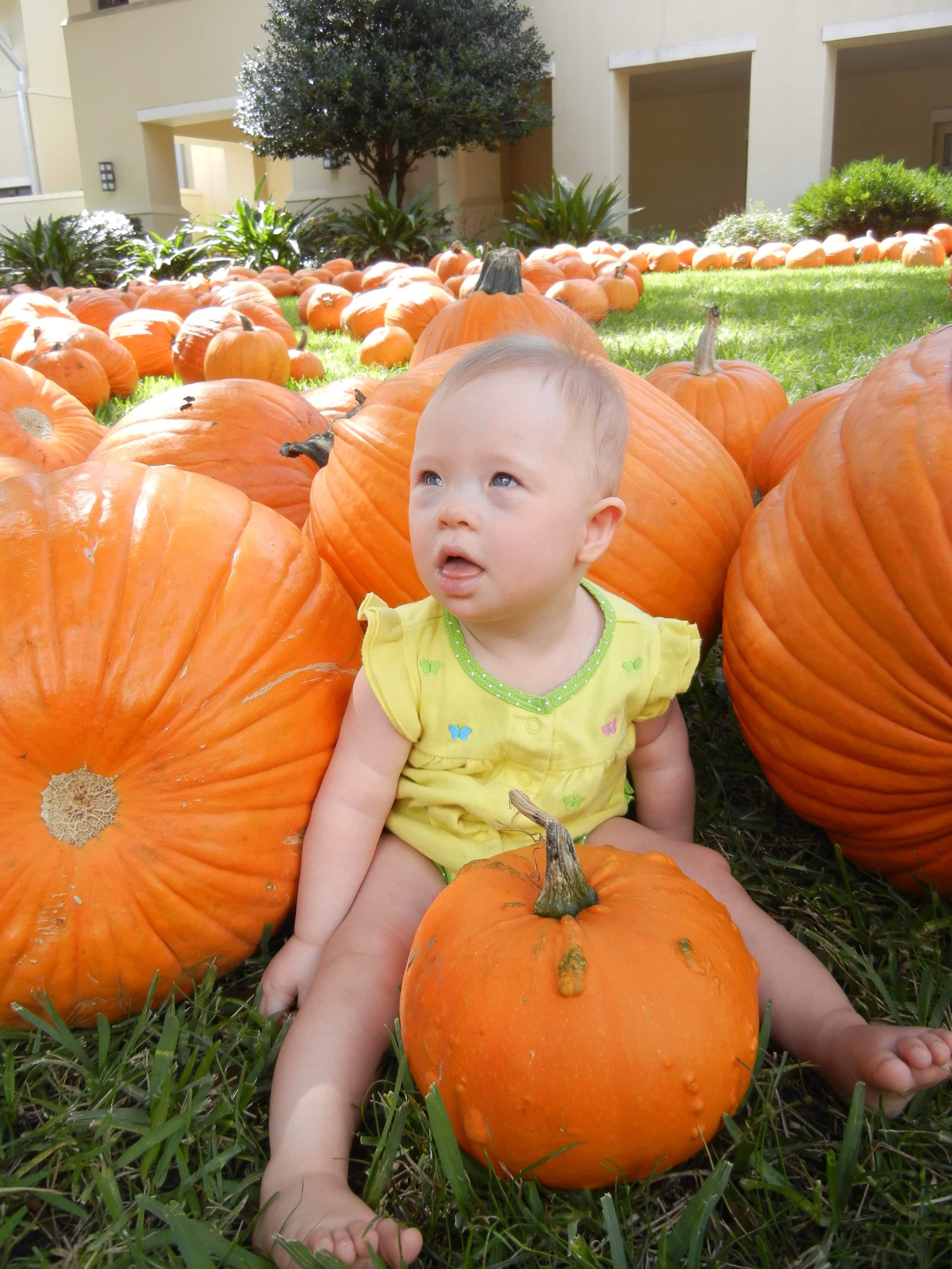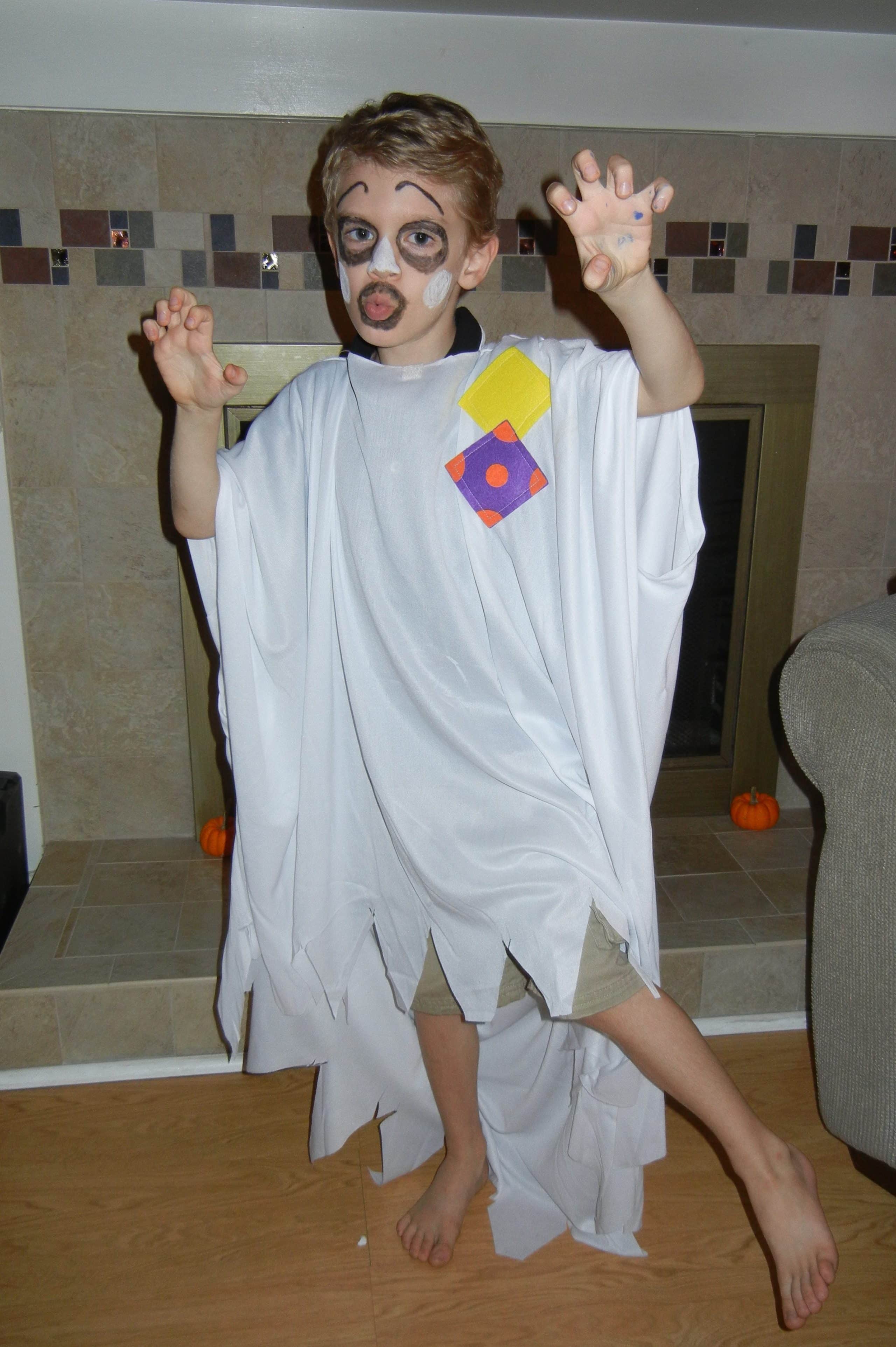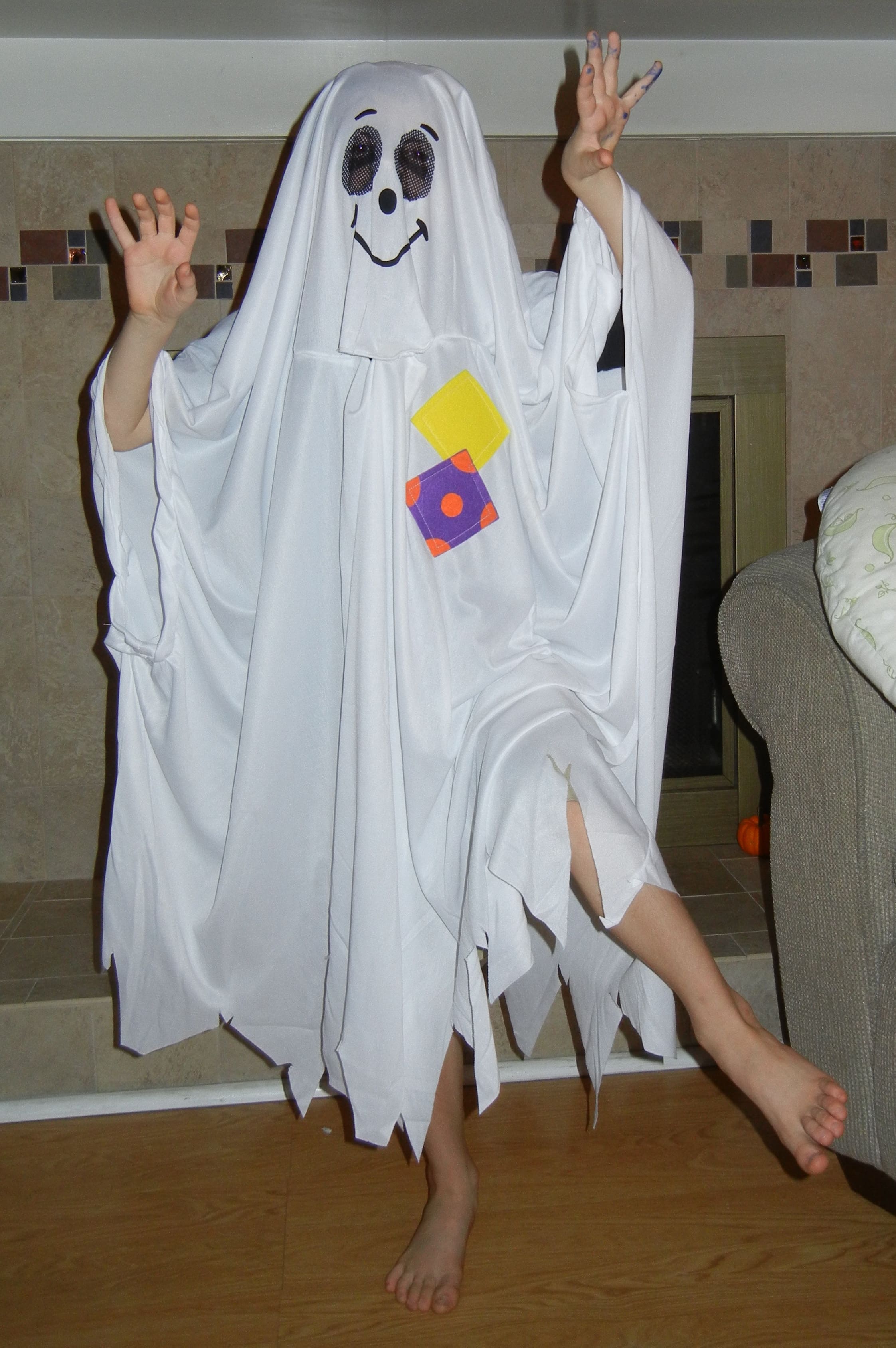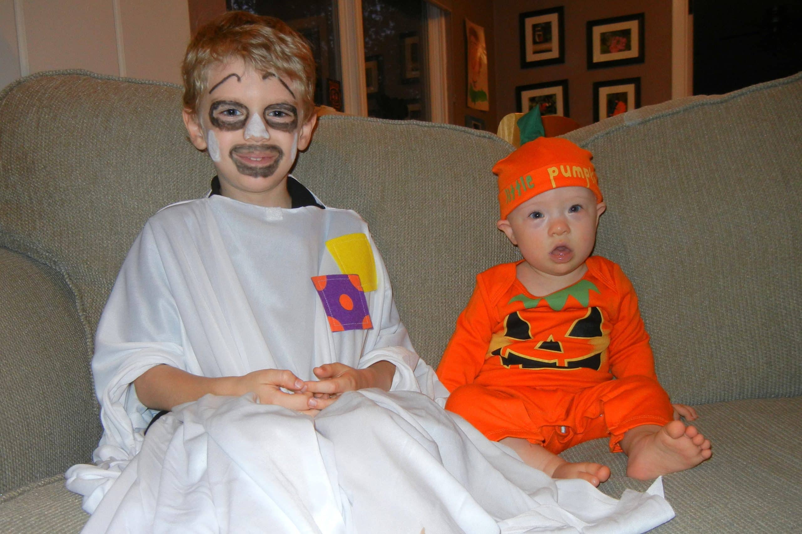 This year, Grant told us he wanted to be a ghost for Halloween so we found him a ghost costume online. Carol altered it to make it have a hood so he could take off the part over his head if he wanted to. And he liked the idea of face paint this year. Carol calls Jenna her little pumpkin so when she found a pumpkin suit at the store, Carol had to pick it up for Jenna to wear.