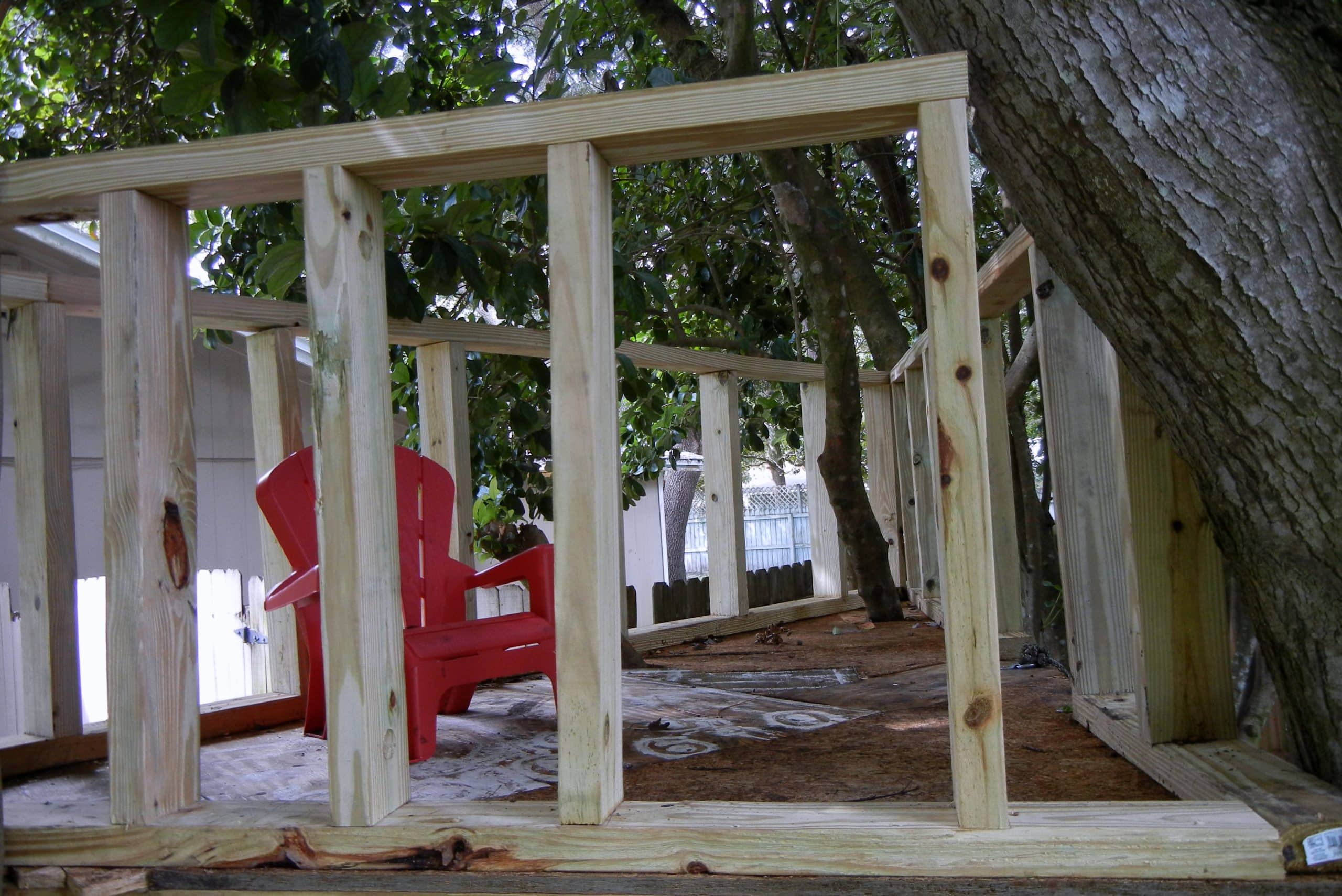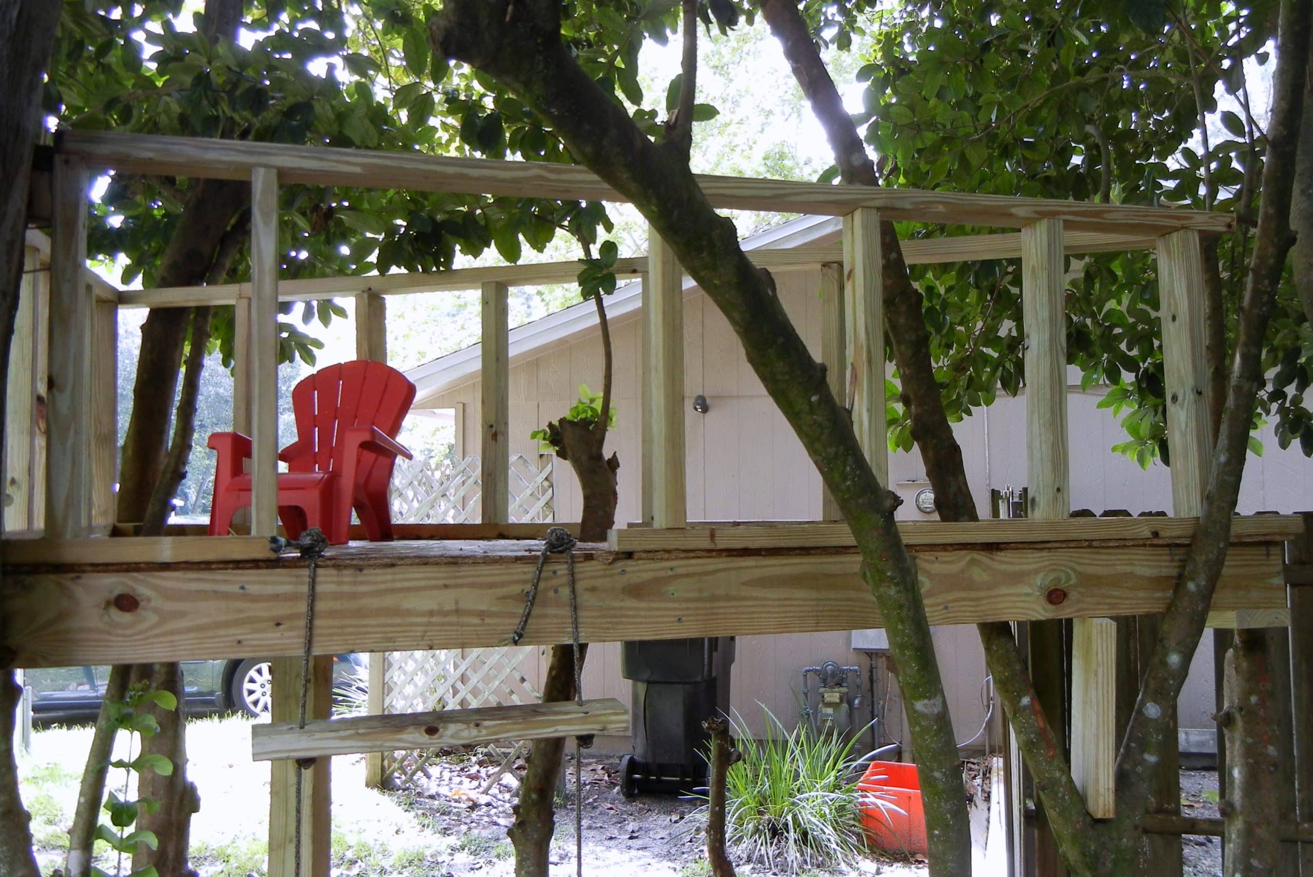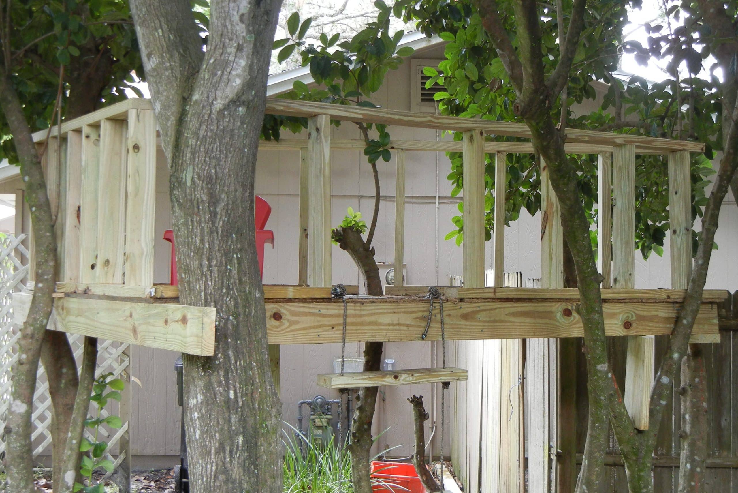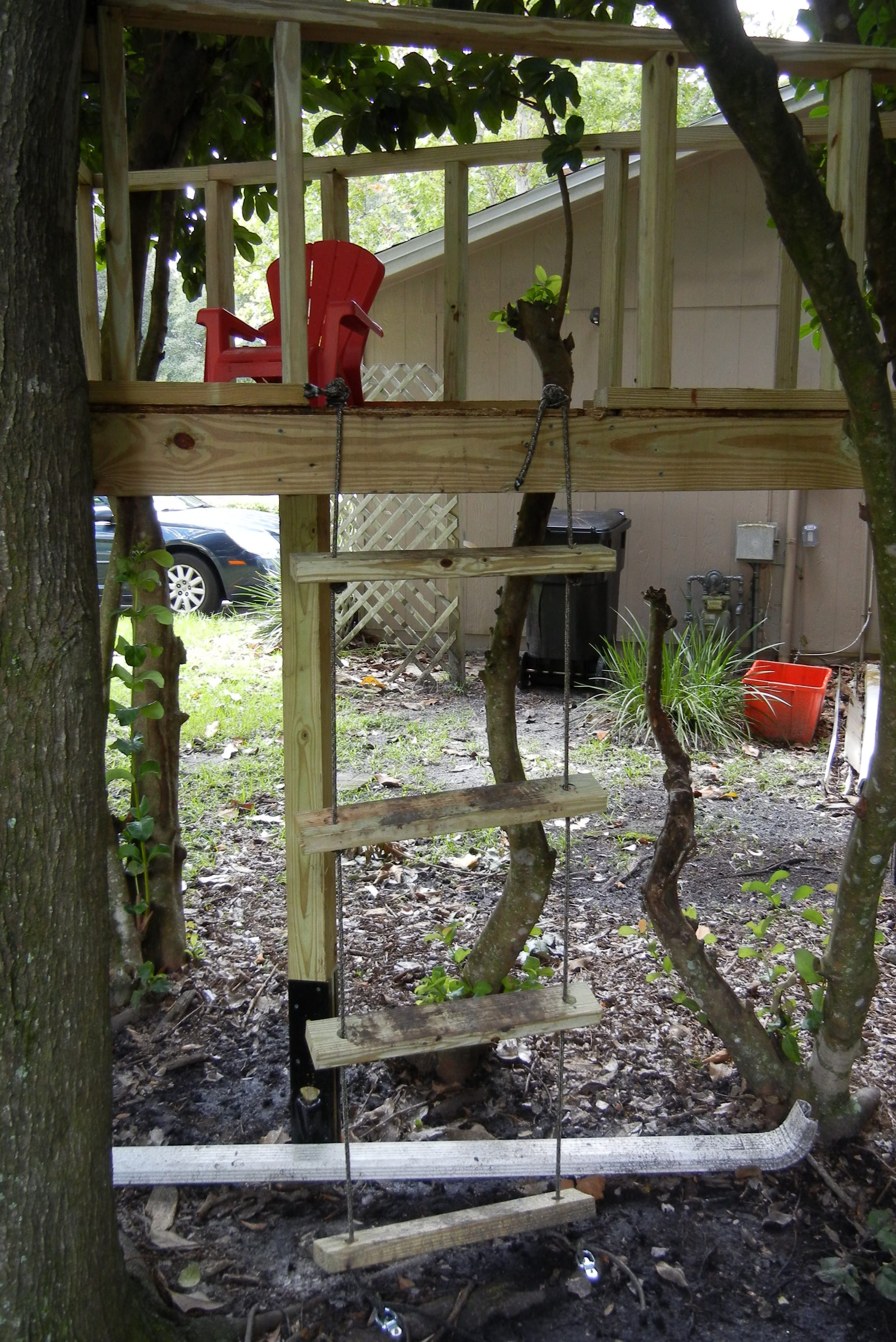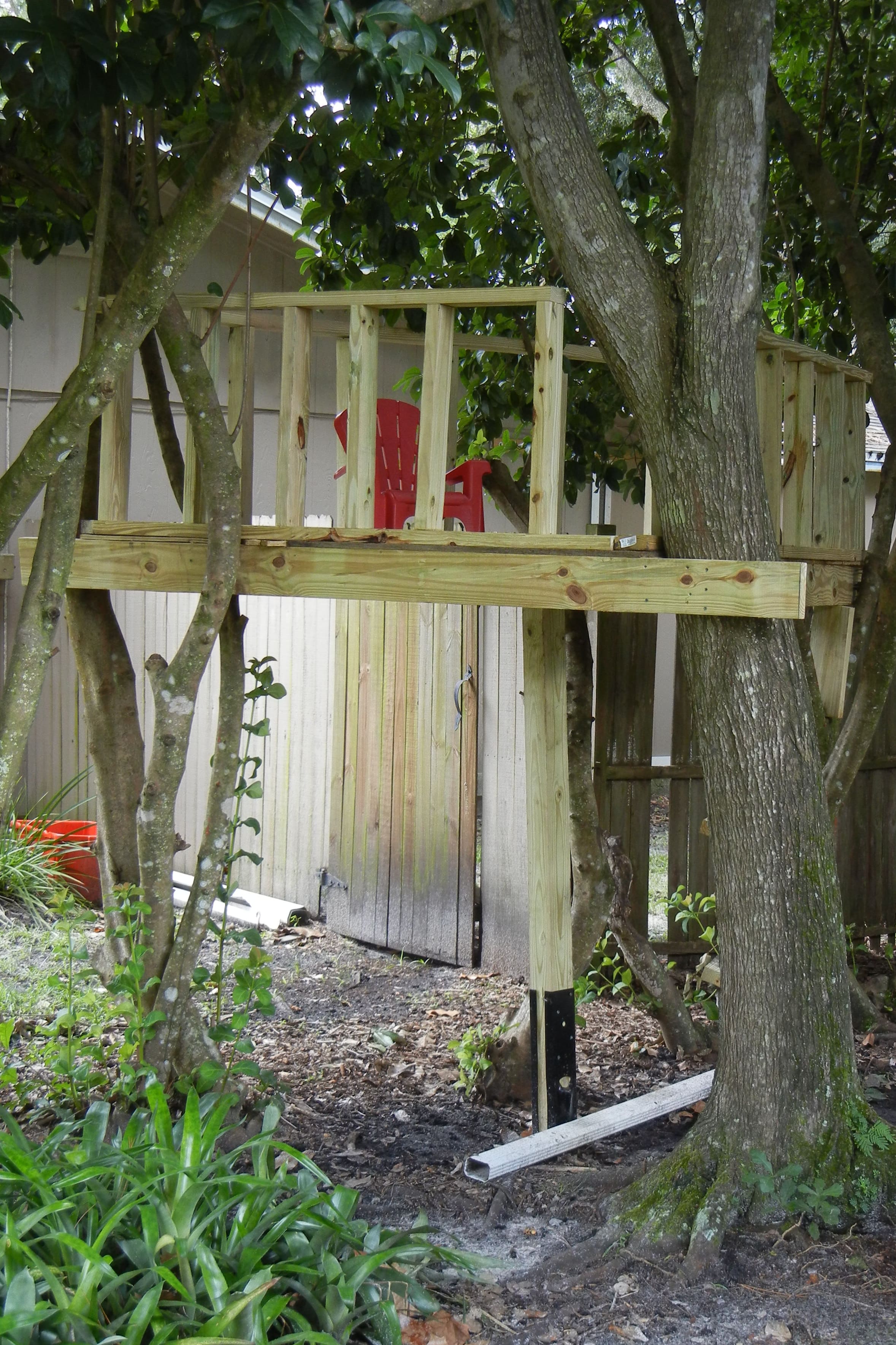 Grant had been asking about a treehouse for a while. So we finally built a little something in the side yard. Here it is: